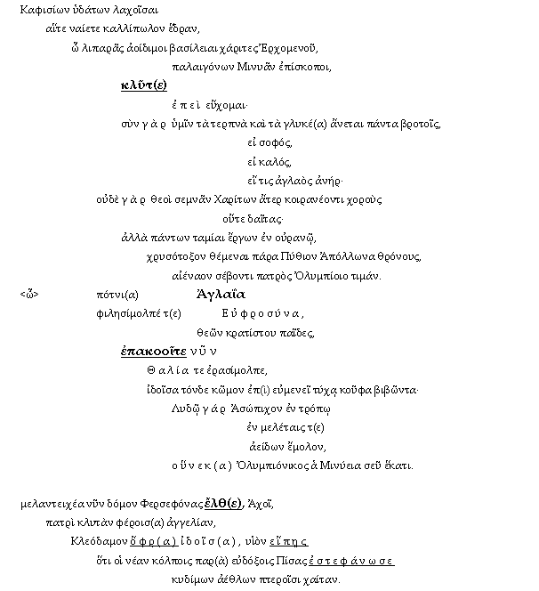 Απάντηση: Ένα από αυτά τα ειδολογικά απαιτούμενα μοτίβα, ο "έπαινος της θεότητας, των Μουσών ή των Χαρίτων" [εδώ, για λόγους εντοπιότητας μετατράπηκε σε: των Χαρίτων] μεταβλήθηκε από τον Πίνδαρο σε πλήρη Ύμνο (και [προσ]ευχή) των Χαρίτων [η παραλλακτική μέθοδος (variatio) έχει πολλές μορφές: διαστολή και συστολή ενός μοτίβου, συνδυασμό με άλλα κ.ο.κ.].