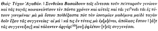 Θεός. Καλή τύχη. Συνθήκη των Βασαίδων που ανήκουν στα τέσσερα γένη και συμμετέχουν στην ταγά (το ανώτατο αξίωμα) για πάντα. Έγινε για τους ίδιους και για τους απογόνους τους. Δεν θα ανεχθούν κανένα να έχει ίδια δικαιώματα με αυτούς και δεν θα δώσουν την ταγά σε μη συγγενή. Όποιος δεν τηρήσει αυτή τη συνθήκη, να αποκηρυχθεί από το γένος του και να πληρώσει ένα ασημένιο τάλαντο στους συγγενείς του.