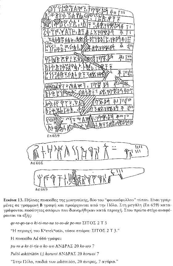- α. Πινακίδα από την Πύλο σε γραμμική Β, β.1. Tonnet, H. 1995. Ιστορία της νέας ελληνικής γλώσσας: Η διαμόρφωσή της (σελ. 24-25), β.2. Χριστίδης, Α.-Φ. 2005. Ιστορία της αρχαίας ελληνικής γλώσσας.