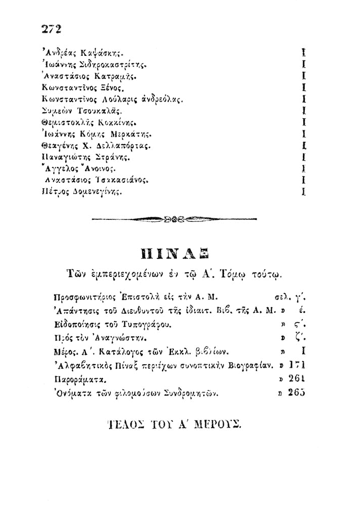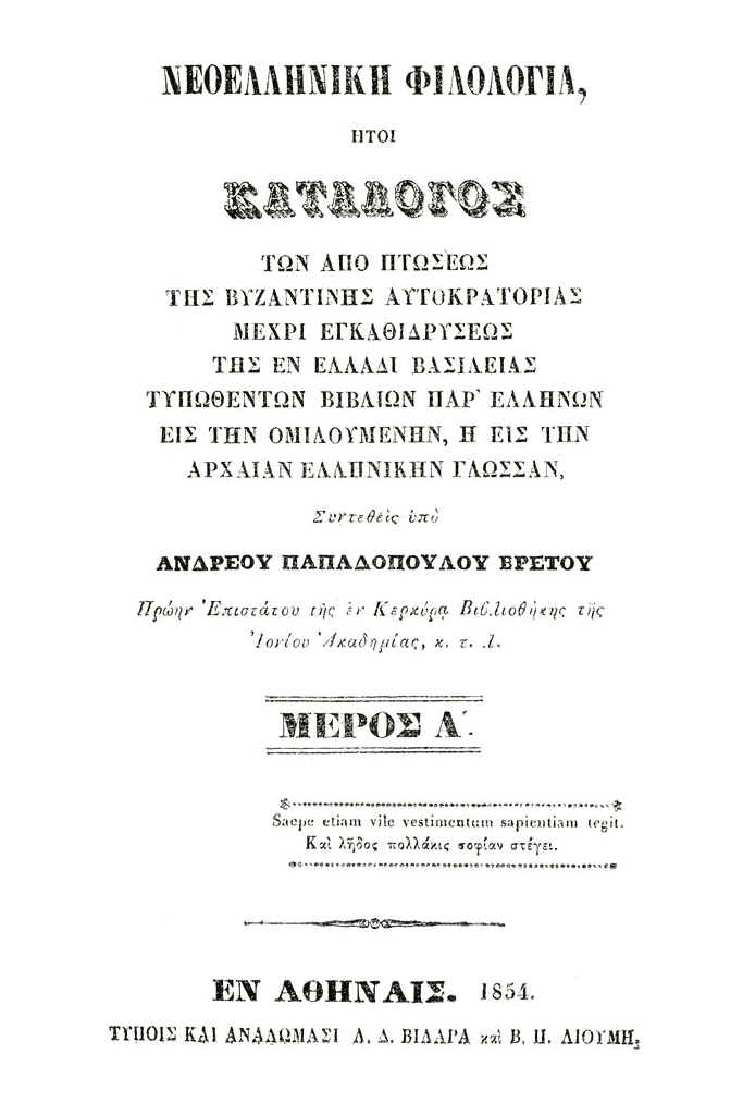 Νεοελληνική Φιλολογία, ήτοι κατάλογος των από πτώσεως της βυζαντινής αυτοκρατορίας μέχρι εγκαθιδρύσεως της εν Ελλάδι βασιλείας τυπωθέντων βιβλίων. Βιογραφία των εν τοις γράμμασι διαλαμψάντων Ελλήνων, 1854