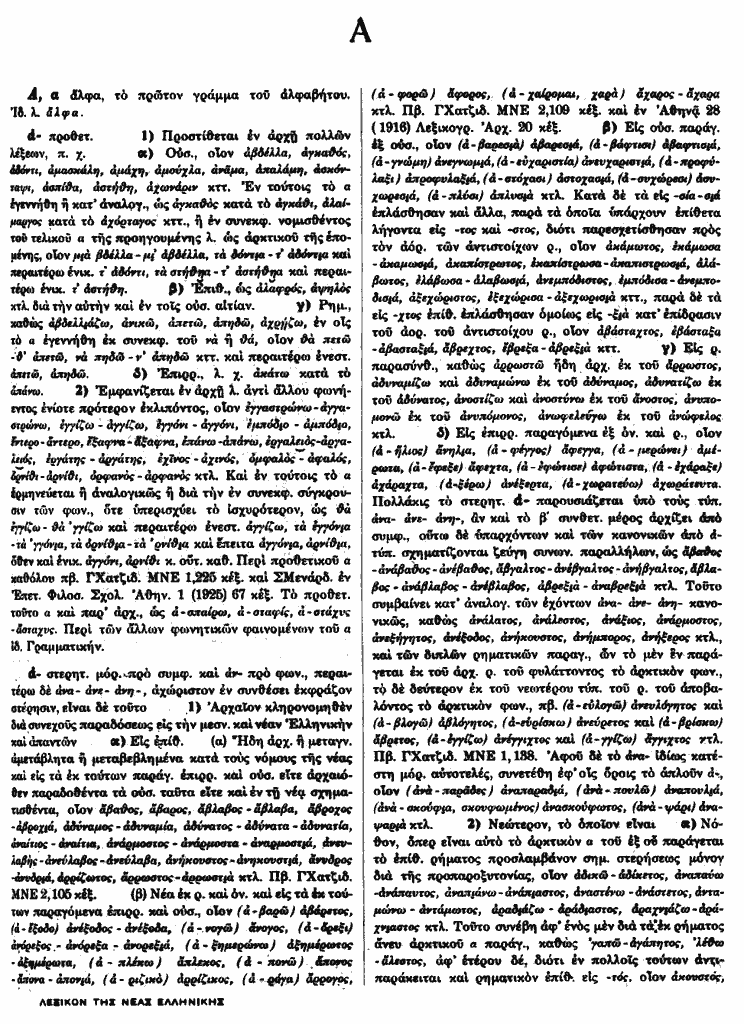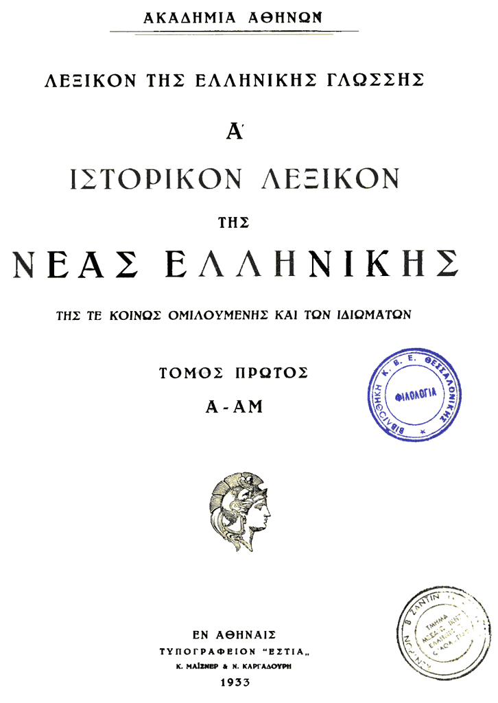 | Εκδοτικά Στοιχεία: | Αθήνα: Ακαδημία Αθηνών: τ. Ι, 1933: α-αμωρωζοσύνη• ΙΙ, 1939: αν-απώρυγα• ΙΙΙ, 1942: άρα-βλέπω• IVα, 1953: βλεφαρίδα-γάργαρος• IVβ, 1980: γαρδαλώνω-γεροδάσκαλος• Vα, 1984: γεροδέματος-γλωσσωτός• Vβ, 1989: γναθάδα-δαχτυλωτός.