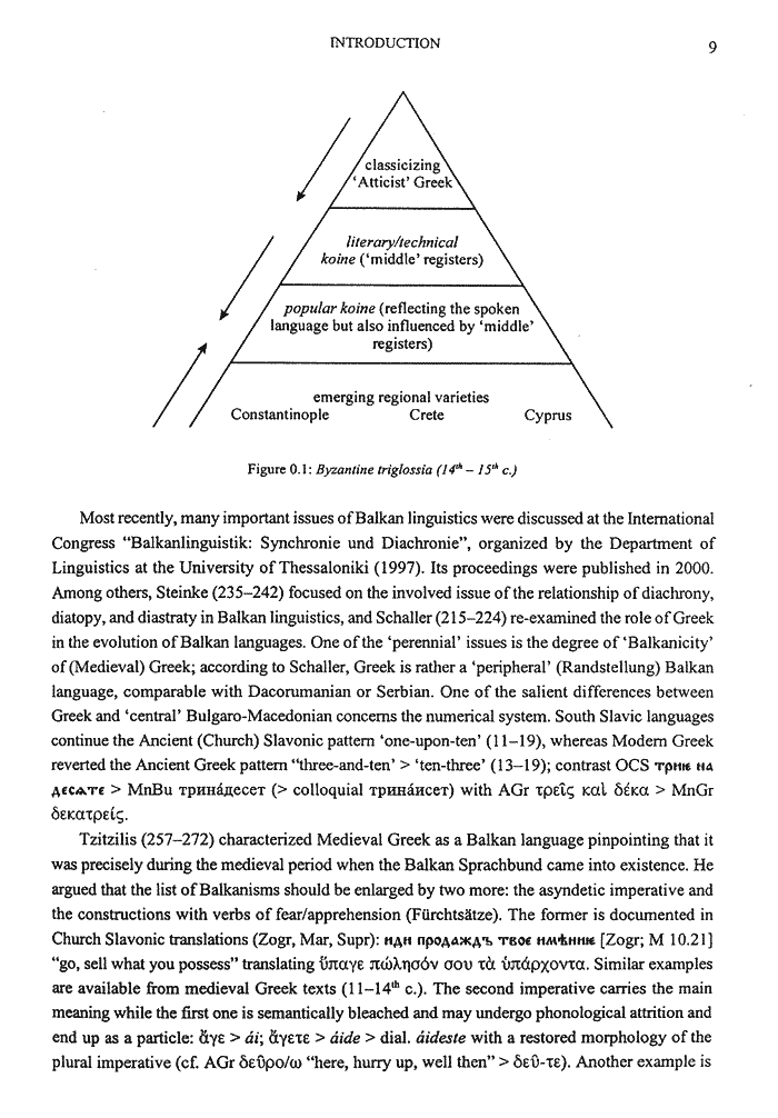 - Στην τρίτη εισαγωγική ενότητα ο συγγραφέας ξεκαθαρίζει ότι η γλωσσολογική μελέτη της Μεσαιωνικής περιόδου παρουσιάζει τρεις διαστάσεις: εκτός από τις δύο γνωστές διαστάσεις της διαχρονίας και της διατοπίας (diatopy), θα πρέπει κανείς να λαμβάνει υπόψην του την επίδραση της κλασικίζουσας αττικιστικής Ελληνικής στη λεγόμενη τεχνική λογοτεχνική κοινή και τις λογιότερες επιδράσεις στη δημώδη κοινή. Πρόκειται για ένα είδος τριγλωσσίας που μπορεί να παρασταθεί μ' ένα συμβατικό κοινωνιο-γλωσσολογικό τρίγωνο.