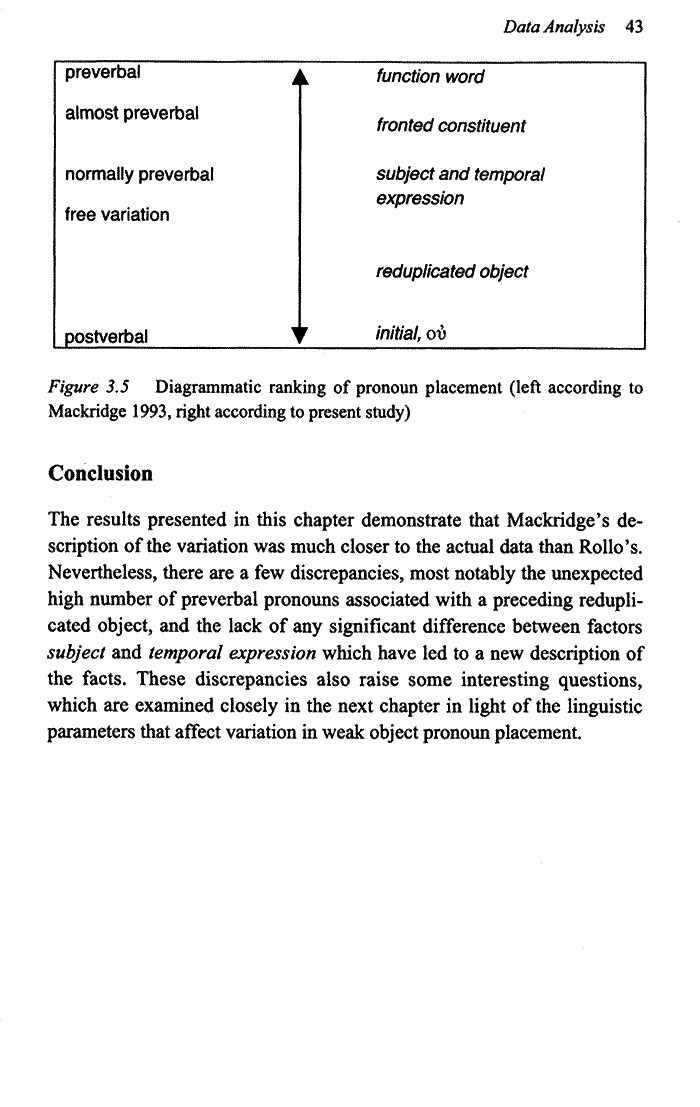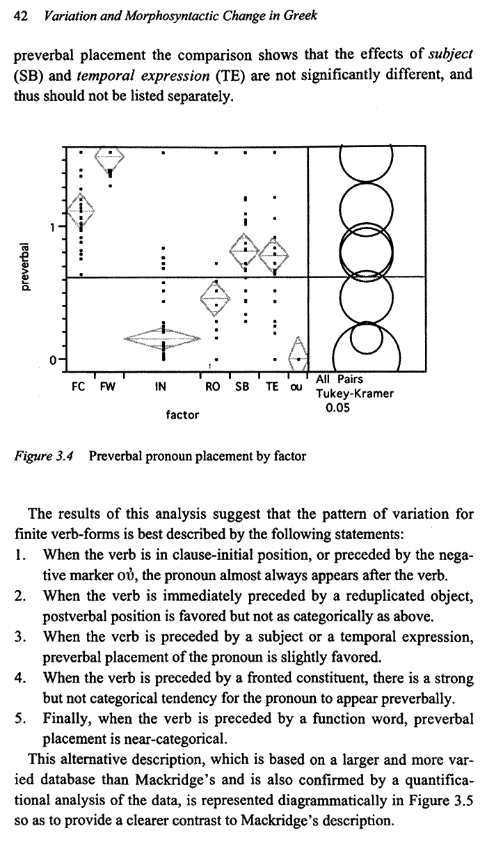 Εξειδικευμένη μελέτη που αξιοποιεί τα στοιχεία προηγουμένων ερευνών ασκώντας παράλληλα κριτική και με αναφορά σε φαινόμενα άλλων γλωσσών. Διαθέτει πλούσια βιβλιογραφία και λεπτομερείς πίνακες δεδομένων. Ο συγγραφέας επιλέγει με προσοχή τα κείμενα που μελετώνται. Εξάλλου διακρίνει σε γλωσσικές και μη παραμέτρους και προκρίνει τη διαχρονική μελέτη του φαινομένου.