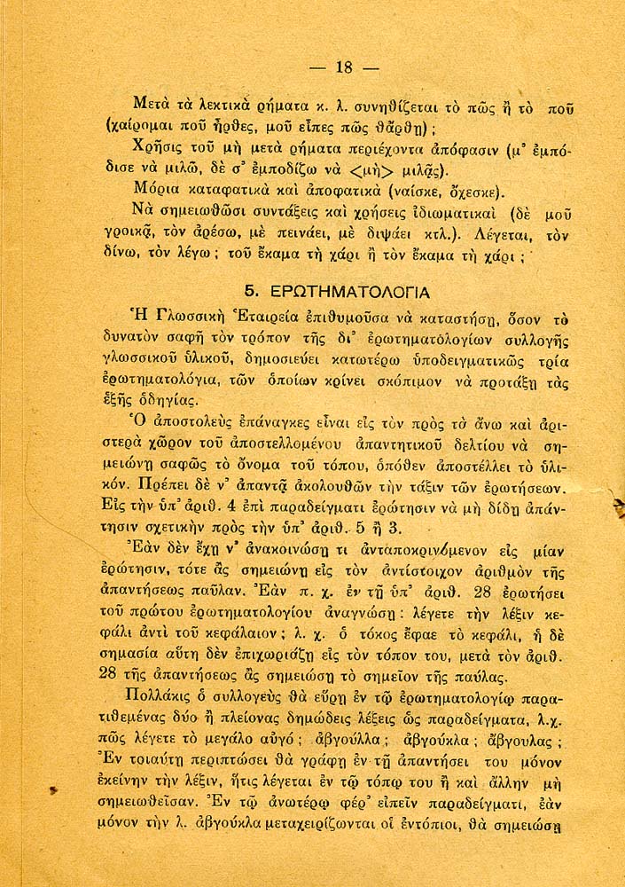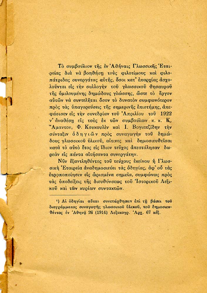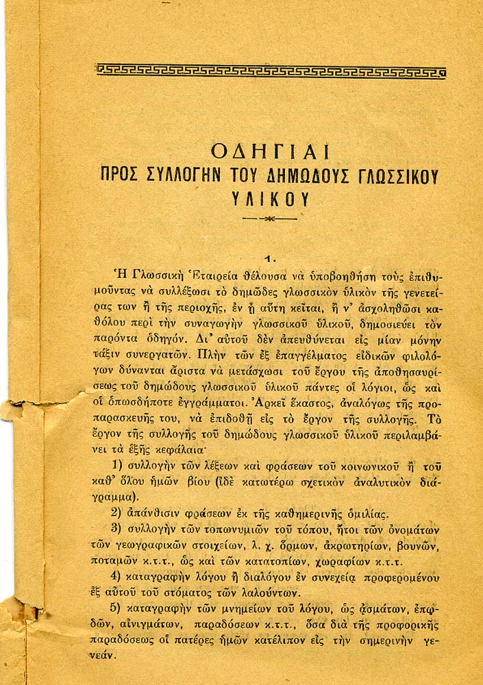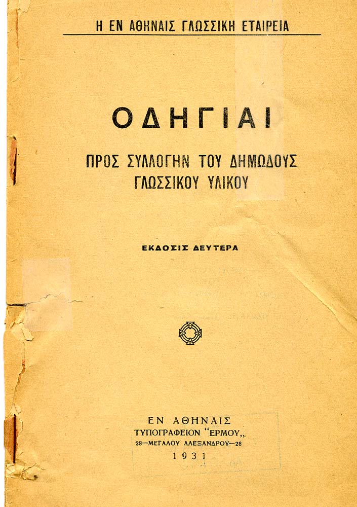 Οδηγίαι προς συλλογήν του δημώδους γλωσσικού υλικού». Οδηγίες της εν Αθήναις Γλωσσικής Εταιρείας (1931) προς ερευνητές και συλλέκτες γλωσσικού υλικού, σύμφωνα και με τις αρχές σύνταξης του Ιστορικού Λεξικού της Ακαδημίας Αθηνών.