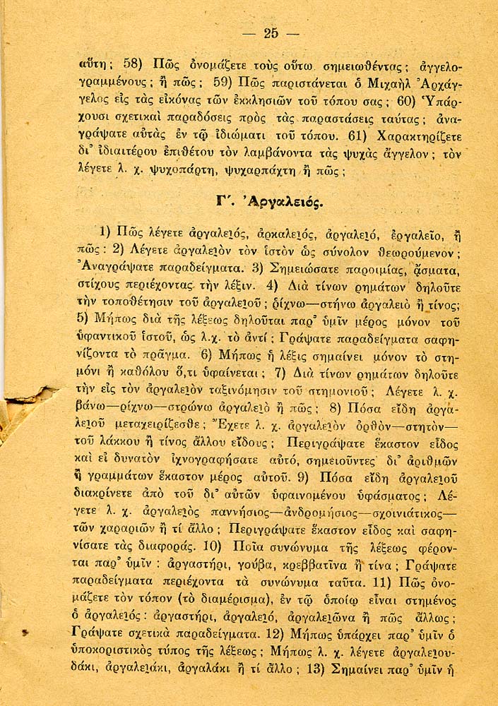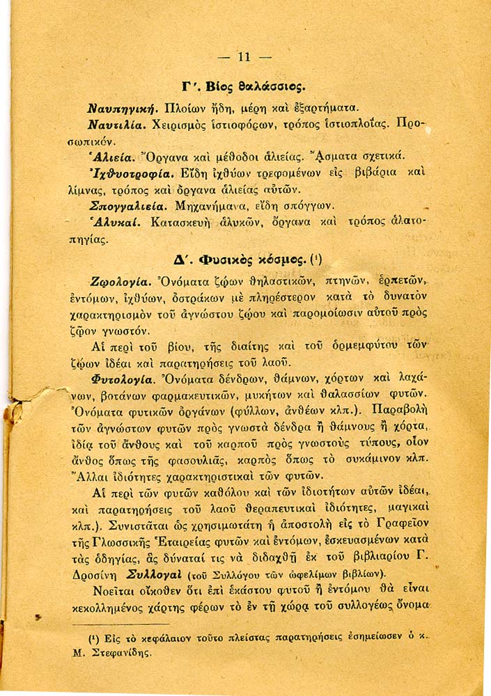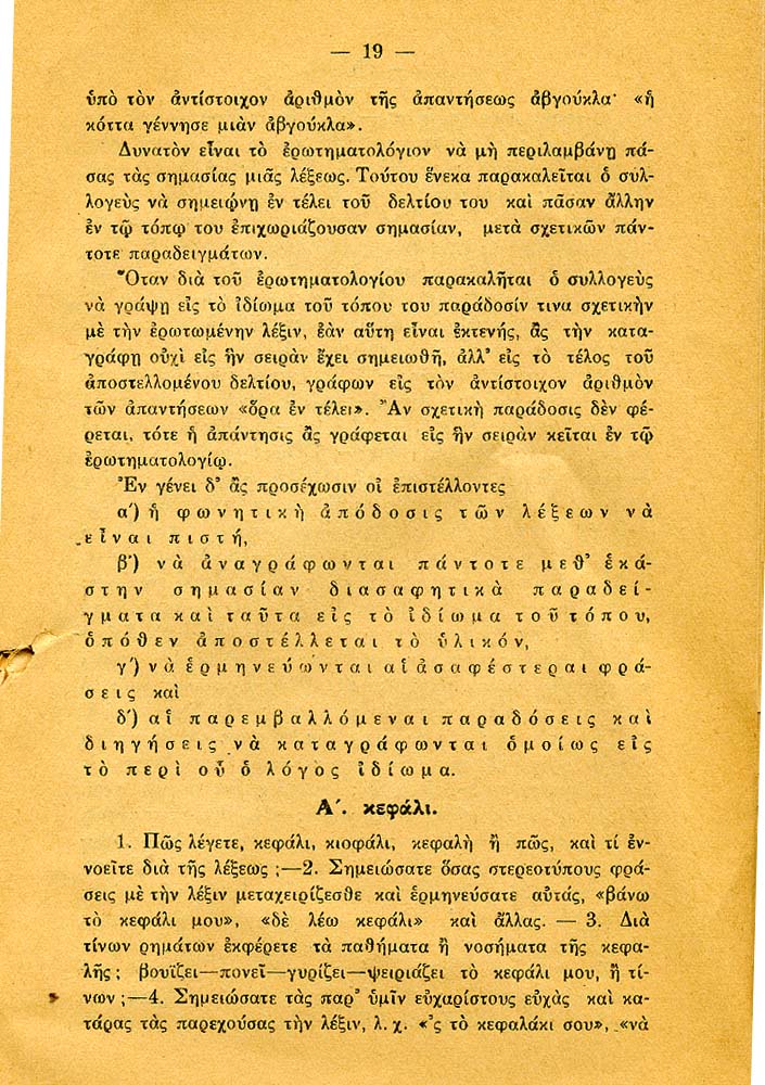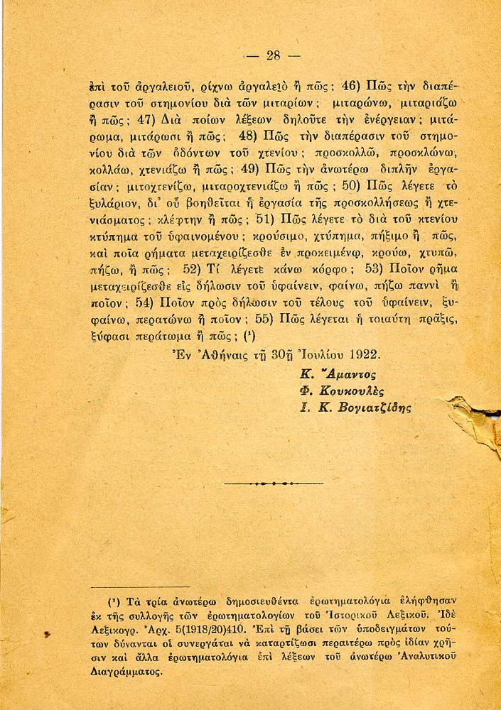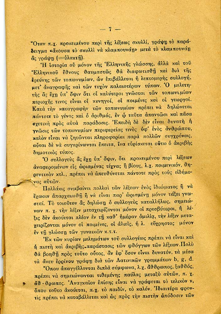Οδηγίαι προς συλλογήν του δημώδους γλωσσικού υλικού». Οδηγίες της εν Αθήναις Γλωσσικής Εταιρείας (1931) προς ερευνητές και συλλέκτες γλωσσικού υλικού, σύμφωνα και με τις αρχές σύνταξης του Ιστορικού Λεξικού της Ακαδημίας Αθηνών.
