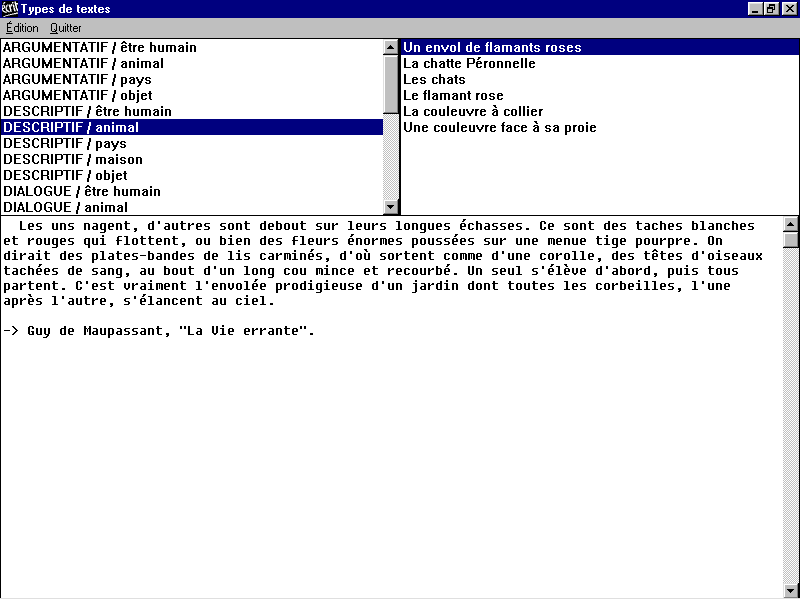 Two different texts, both describing a snake, were mixed : one of them had an encyclopedic scope, the other was taken from a narration (see Appendice 1). The students, in pairs, had to sort them, copy them into the word processor, and print them. As it was the first time they had used Gammes d'écriture, the teacher, beside the linguistic goal, wanted them to get used to some of the important functions of the software, such as copy and paste into the word processor. All students managed this task well and in a cooperative way.