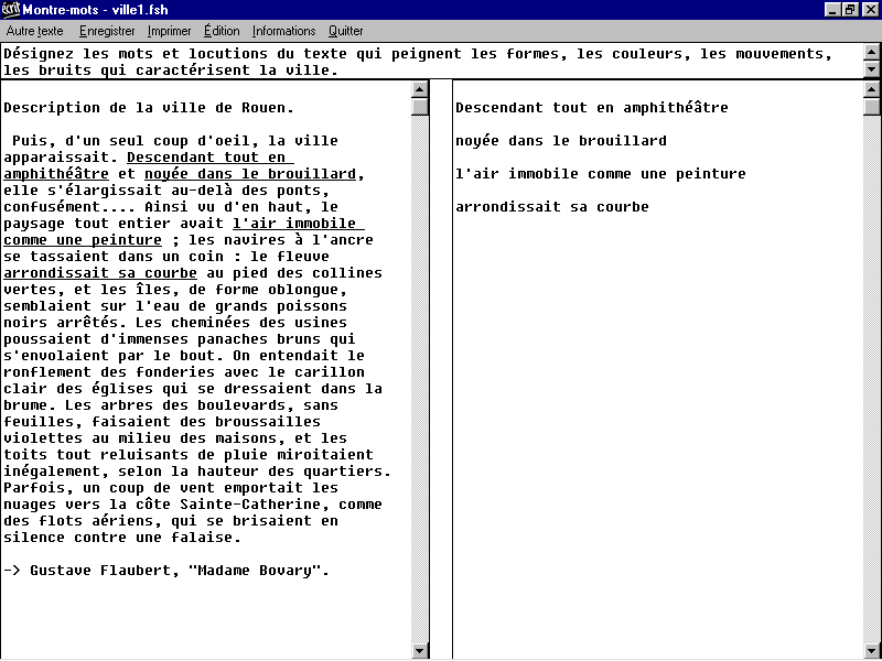 The students had pointed out that novels often begin with a place description. So, they were given a Flaubert text describing Rouen (from L'éducation sentimentale), with several gaps they had to guess and fill with the help of the context. They found the task difficult, and had to develop strategies : word search, search of synonyms (bateau/navire), use of dictionary ; they also discovered that they had to spell accurately, with the right " accents ", otherwise the computer wouldn't " take the word ". The same text was then given to them again, but this time the descriptive organizers were hidden. Finally a third activity consisted in identifying forms, sounds, colours and movements in Flaubert description. The teacher had a feeling of intense student activity and exchange.