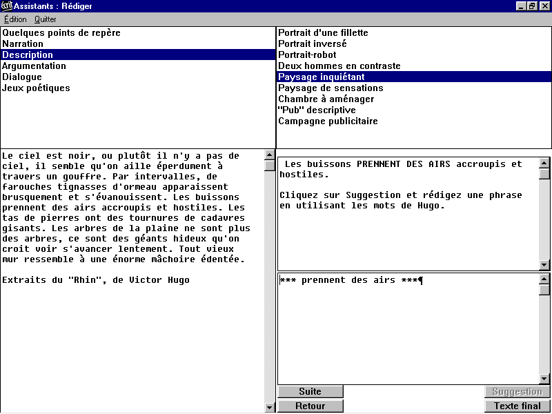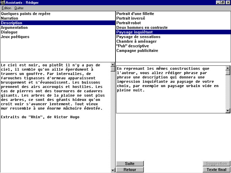 A Gammes d'écriture " Assistant " consists in guiding students in writing a city description which provokes a feeling of fear. This activity is accompanied by a text of Victor Hugo describing a landscape at dusk (see Appendice 4).