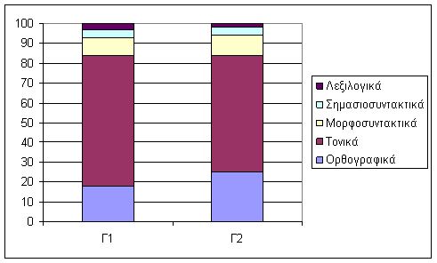 Στο ακόλουθο γράφημα παρουσιάζονται τα ποσοστά λαθών ανά κατηγορία και για τις δύο ομάδες που αναλύθηκαν: