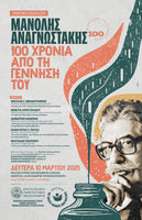 Η Κοσμητεία της Φιλοσοφικής Σχολής του ΑΠΘ, τα Τμήματα Φιλολογίας και Φιλοσοφίας & Παιδαγωγικής του ΑΠΘ, και ο Όμιλος Φίλων του Ποιητή Μανόλη Αναγνωστάκη, διοργανώνουν τιμητική εκδήλωση για τα 100 χρόνια από τη γέννηση του Μανόλη Αναγνωστάκη. Η εκδήλωση θα γίνει τη Δευτέρα 10 Μαρτίου 2025 και ώρα 12.00, στην Αίθουσα Τελετών του Παλαιού Κτιρίου της Φιλοσοφικής Σχολής του ΑΠΘ (αίθουσα "Αλέξανδρος Παπαναστασίου").