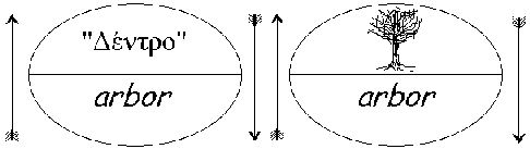 Tα δυο αυτά στοιχεία είναι βαθύτατα ενωμένα και το ένα φέρνει το άλλο. Για ν' αναζητήσουμε την έννοια της λατινικής λέξης arbor ή τη λέξη με την οποία η λατινική δηλώνει την ιδέα "δένδρο", είναι ολοφάνερο ότι μόνο οι προσεγγίσεις που έχει καθιερώσει η γλώσσα μάς φαίνονται σύμφωνες με την πραγματικότητα και απομακρύνουμε οτιδήποτε άλλο που θα μπορούσαμε να φανταστούμε.