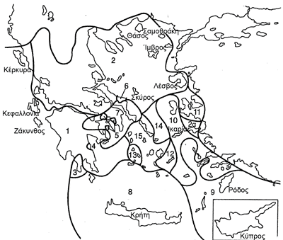 Ο χάρτης μάς επιτρέπει να χωρίσουμε τον ενιαίο χώρο όπου μιλιούνται οι ελληνικές διάλεκτοι κατά το γύρισμα του 19ου αιώνα σε δεκαπέντε περιοχές, ως εξής: