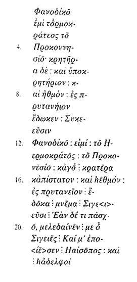 (Αττ.): Είμαι του Φανοδίκου, του Ερμοκράτους, από την Προκόννησο κι εγώ∙ προσέφερα κρατήρα και το στήριγμά του και τον ηθμό στο πρυτανείο για να με θυμούνται οι Σιγιείς. Αν πάθω κάτι, φροντίστε με, Σιγιείς! Και εμένα με έφτιαξε ο Αίσωπος και τα αδέλφια του.