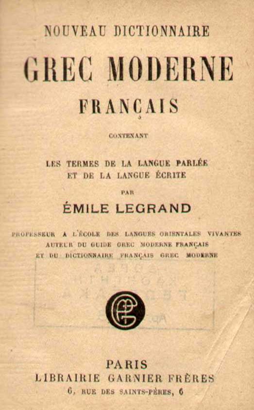 Το εσώφυλλο του Ελληνογαλλικού Λεξικού του Émile Legrand (1882).