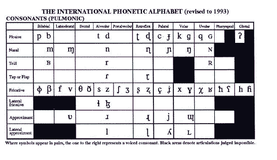 O πίνακας των συμφώνων που ακολουθεί παρέχεται από τη Διεθνή Φωνητική Ένωση (International Phonetic Association). Στη στήλη (αριστερά) δίνονται οι όροι για τις θέσεις παραγωγής των συμφώνων. Στην οριζόντια γραμμή (επάνω) δίνονται οι όροι για τον τρόπο παραγωγής τους. Όπου εμφανίζονται σύμβολα συμφώνων σε ζεύγη (π.χ. p, b), το πρώτο είναι άηχο (δηλαδή δεν πάλλονται οι φωνητικές χορδές για την παραγωγή του), ενώ το δεύτερο είναι ηχηρό. Οι αρθρώσεις που είναι αδύνατο να παραχθούν αντιστοιχούν στις μαύρες περιοχές του πίνακα.