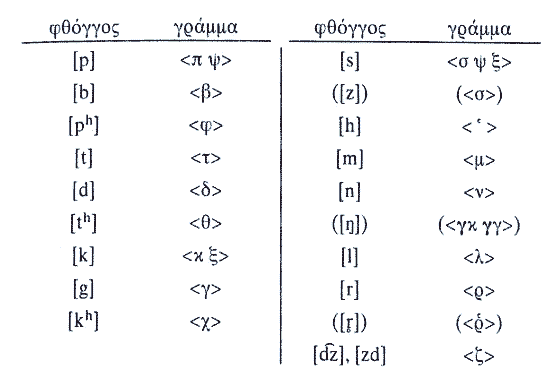 Οι αντιστοιχίες γραμμάτων-συμβόλων που παρέχονται πιο κάτω για τα αρχαία ελληνικά προέρχονται από πίνακα στο Πετρούνιας (2001β, 419).