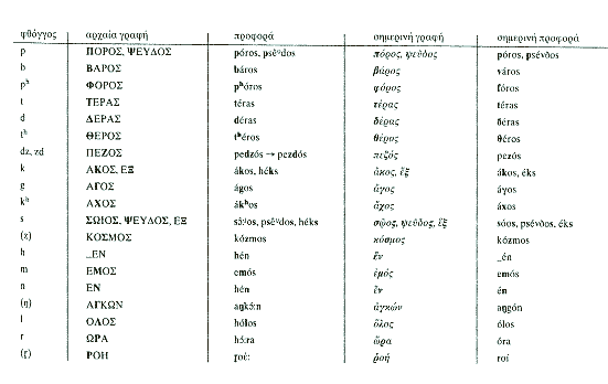 Ο πίνακας που ακολουθεί παρέχει παραδείγματα γραφής και προφοράς λέξεων της αρχαίας ελληνικής σε αντιπαράθεση με την προφορά των ίδιων λέξεων στη νεοελληνική. Προέρχεται από την ίδια πηγή με τον προηγούμενο (Πετρούνιας 2001β, 419).