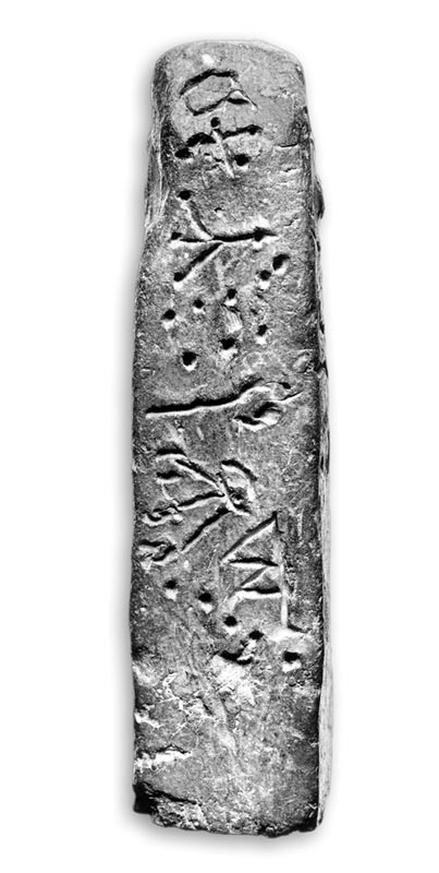 β. Πήλινη ράβδος από την Κνωσό. Κρητική «ιερογλυφική» γραφή.