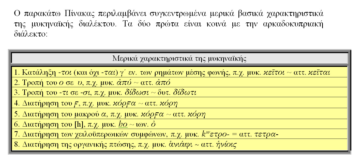 Η μυκηναϊκή διάλεκτος χωρίζεται από τις υπόλοιπες διαλέκτους με ένα χρονικό διάστημα εξακοσίων τουλάχιστον ετών. Τα κείμενα της μυκηναϊκής (γραμμένα στη γραμμική Β) χρονολογούνται στον 13ο αιώνα π.Χ. και θα χρειαστεί να περάσουν εξακόσια χρόνια για να αρχίσουμε να έχουμε (σε αλφαβητική γραφή) μαρτυρίες, δηλαδή επιγραφές, για τις αρχαίες διαλέκτους. Αυτή η μεγάλη χρονική απόσταση εξηγεί την αρχαϊκότητα της μυκηναϊκής διαλέκτου. Η τροπή του -τι σε -σι, που διαχωρίζει τις ανατολικές από τις δυτικές διαλέκτους, έχει ήδη γίνει στη μυκηναϊκή, όπως δείχνει ο τύπος di-do-si = δίδωσι και όχι δίδωτι. Γι' αυτό η μυκηναϊκή κατατάσσεται στις ανατολικές διαλέκτους. Αλλά η μυκηναϊκή διατηρεί χαρακτηριστικά που έχουν χαθεί στις ανατολικές διαλέκτους, όπως τις γνωρίζουμε από τις μαρτυρίες των αλφαβητικών επιγραφών (από το 750 π.Χ. και μετά). Έτσι, διατηρεί τον φθόγγο [w] (το δίγαμμα) που, όπως είδαμε, έχει χαθεί στις ανατολικές (αλλά όχι στις δυτικές) διαλέκτους. Στον αττικό τύπο κόρη, λ.χ., αντιστοιχεί ο μυκηναϊκός κόρϝα[kόrwa]. Αλλά ο τύπος κόρϝαφανερώνει και κάτι άλλο. Αν θυμάστε, λέγαμε πριν ότι οι ανατολικές διάλεκτοι ξεχωρίζουν από τις δυτικές κατά το ότι οι δεύτερες έχουν ᾱ (δηλαδή μακρό [a]) εκεί που οι πρώτες έχουν η, δηλαδή μακρό [e]: μήτηρ στις ανατολικές διαλέκτους, μάτηρ στις δυτικές· κόρα στις δυτικές διαλέκτους, κόρη στις ανατολικές. Στη μυκηναϊκή, αν και ανατολική διάλεκτο, βρίσκουμε τον τύπο κόρϝα. Τί σημαίνει αυτό; Σημαίνει ότι αυτή η συγκεκριμένη διαφορά μεταξύ ανατολικών και δυτικών διαλέκτων δεν ισχύει ακόμα στον 13ο αιώνα π.Χ., την εποχή δηλαδή της μυκηναϊκής. Την εποχή αυτή ανατολικές και δυτικές διάλεκτοι έχουν ᾱ. Η τροπή του ᾱ σε η (δηλαδή σε μακρό [e]), που διαχώρισε, ως προς αυτό το φαινόμενο, ανατολικές και δυτικές διαλέκτους, έγινε μετά τη μυκηναϊκή εποχή.