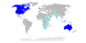 Εικ. 3: Χάρτης κρατών με την αγγλική ως επίσημη (μπλε) ή μία από τις επίσημες (γαλάζιο)