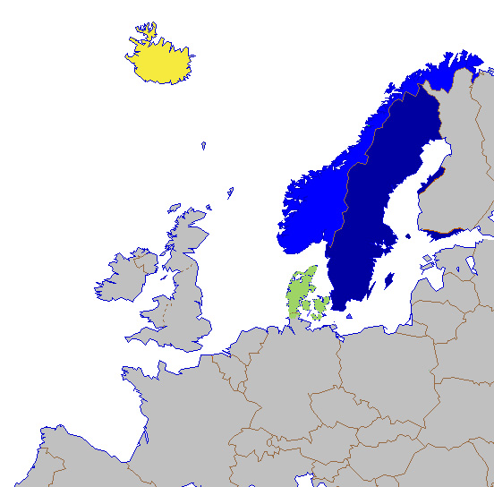 Εικ. 5: Χάρτης Σκανδιναβικών γλωσσών στις οποίες ανήκουν οι Νορβηγοί και οι Δανοί