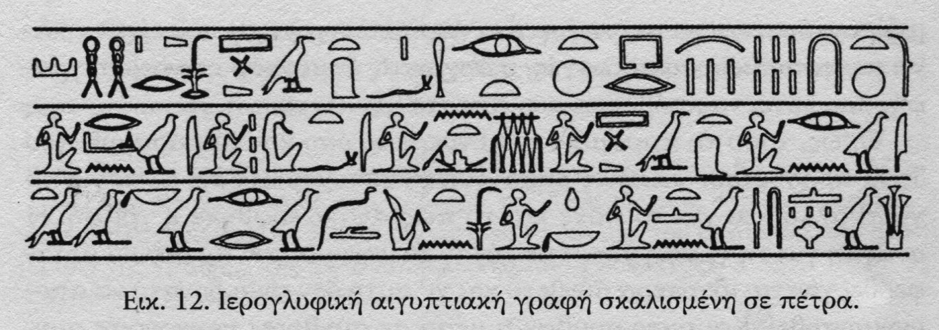 Πριν το τέλος της 4ης χιλιετίας (γύρω στο 3200) π.Χ. θα εμφανιστεί η γραφή στην Αίγυπτο (ιερογλυφική γραφή· βλ. εικ. 12). Η ανάγκη που τη γέννησε ήταν, και εδώ, κοινωνική: η ενοποίηση της Αιγύπτου κάτω από έναν φαραώ   (βασιλιά) και οι ανάγκες της διοίκησης. Επιπλέον, υπήρχαν και ειδικότερες ανάγκες που γεννιούνταν από μια ιδιαιτερότητα της Αιγύπτου   - τις πλημμύρες του Νείλου. Οι ετήσιες αυτές πλημμύρες υποχρέωναν τους Αιγύπτιους να ξαναπροσδιορίζουν κάθε χρονιά τα όρια και τις εκτάσεις των χωραφιών που χάνονταν κάτω από το νερό. Η γραφή ήταν ένα απαραίτητο εργαλείο για μια τέτοια περίπλοκη δραστηριότητα. Κατά την αιγυπτιακή μυθολογία εφευρέτης της γραφής ήταν ο Θωθ, ο θεός της σοφίας.