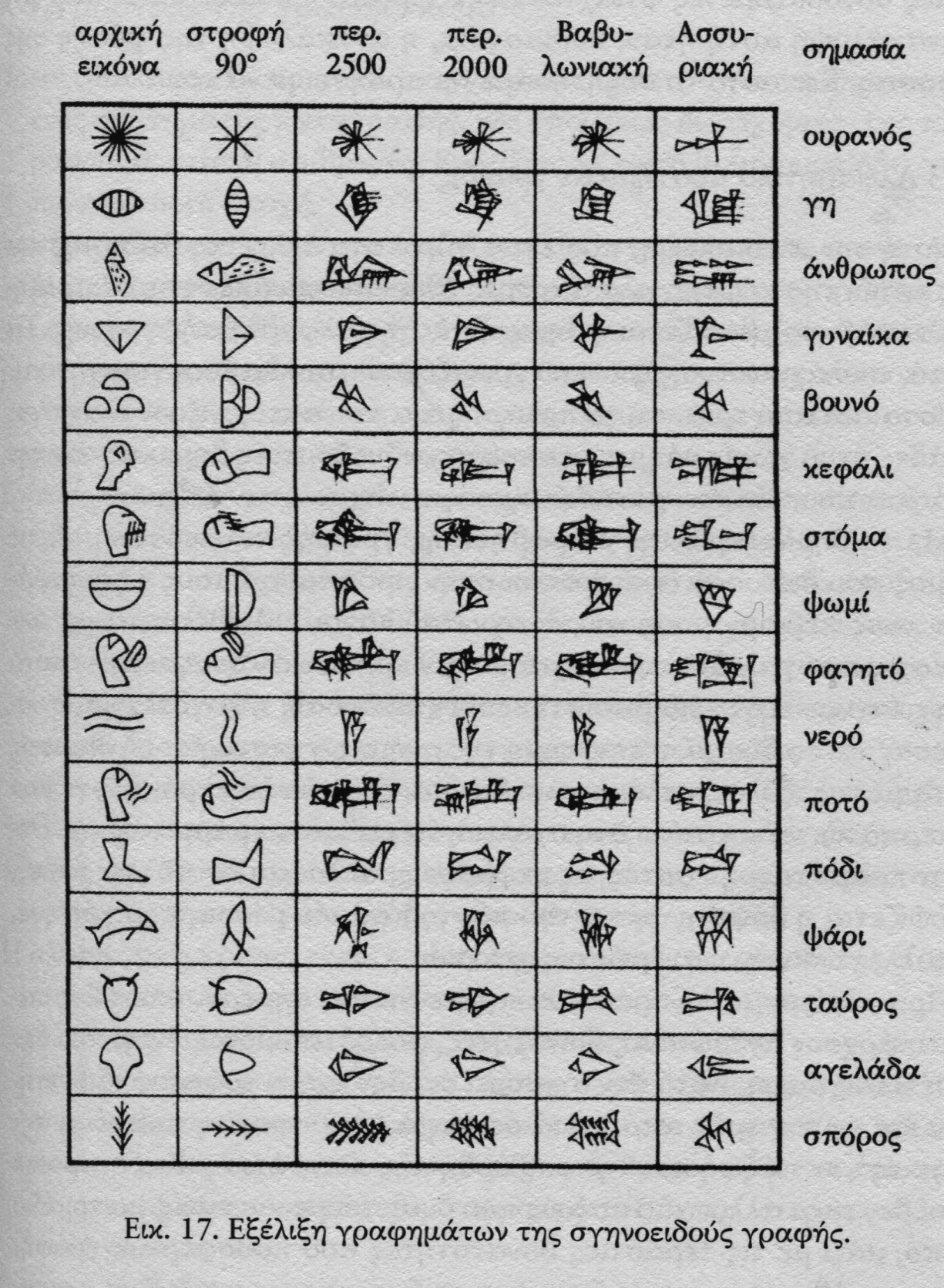Με βάση αυτό το σύγχρονο παράδειγμα μπορούμε να καταλάβουμε γιατί στην αρχαιότητα (στη Μεσοποταμία, στην Αίγυπτο) η γνώση των σημασιογραφικών/ιδεογραφικών συστημάτων ήταν προνόμιο μιας κλειστής ομάδας «ειδικών» (ιερέων, γραφέων). Μπορούμε επίσης να καταλάβουμε, πάλι μέσα από το σύγχρονο παράδειγμα, γιατί ήδη γύρω στο 4000-3000 π.Χ. γεννιέται στις πόλεις της Μεσοποταμίας η ανάγκη για ένα οικονομικότερο σύστημα γραφής, για ένα σύστημα δηλαδή όπου τα σημεία της γραφής θα είναι φωνογραφικά, θα αποδίδουν δηλαδή γλωσσικούς ήχους και όχι αντικείμενα ή σημασίες (βλ. εικ. 17). Η ανάγκη για ένα τέτοιο σύστημα γεννιέται και πάλι από τις κοινωνικές συνθήκες. Από τη στιγμή που ο γεωργικός τρόπος παραγωγής οδήγησε σιγά σιγά σε μεγαλύτερη αφθονία αγαθών, δημιούργησε πολυάνθρωπες πόλεις (στη Μεσοποταμία και αργότερα στην Αίγυπτο), κοινωνική ιεραρχία, διοικητικούς μηχανισμούς, τη δυνατότητα μετακινήσεων και επαφών (με την εφεύρεση του τροχού), ένα σημασιογραφικό σύστημα που είχε την αρχή του στις ανάγκες της αρίθμησης καλούνταν τώρα να εκφράσει ένα τεράστιο φάσμα εννοιών: διοίκηση, νόμους, θρησκεία, φορολογία κλπ. Αυτή ακριβώς η «πίεση» θα οδηγήσει σιγά σιγά στην ανακάλυψη των φωνογραφικών συστημάτων - συστημάτων όπου τα γραφικά σημεία αντιστοιχούν σε γλωσσικούς ήχους, όχι σε πράγματα και σημασίες. Άλλωστε πώς να δηλώσει κανείς εικονογραφικά/ιδεογραφικά κύρια ονόματα (ονόματα τόπων, προσώπων) ή λέξεις με ασαφές νόημα, όπως λ.χ. τη λέξη και, τη λέξη αλλά και άλλες;