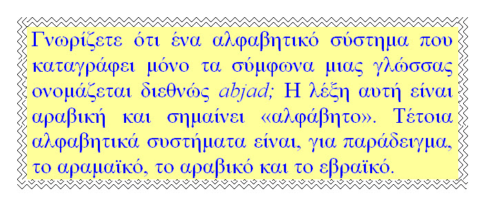 Αυτή η ελλειπτικότητα, ωστόσο, προϋποθέτει, όπως λέγαμε, έναν «ασκημένο» αναγνώστη που θα καταβάλει κάποιον κόπο για να κατανοήσει το γραμμένο κείμενο. Για να αποφευχθεί αυτό, θα προστεθούν αργότερα σε αλφάβητα που προέρχονται από το φοινικικό (όπως το εβραϊκό) σημάδια και για τα φωνήεντα, έτσι ώστε η αλφαβητική καταγραφή να είναι πλήρης. Θα έχετε ίσως δει τον τρόπο που γράφονται τα αραβικά - σημιτική γλώσσα και αυτά. Θα προσέξατε ίσως ότι πάνω και κάτω από το κυρίως «σώμα» του γραμμένου κειμένου (αυτά είναι τα σύμφωνα) υπάρχουν μικρά σημαδάκια (τελείες και άλλα): αυτά είναι τα φωνήεντα.