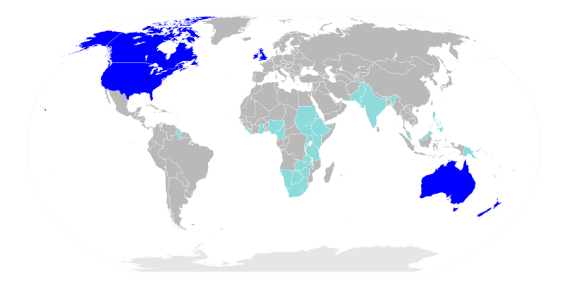 Χάρτης των κρατών που έχουν την αγγλική ως επίσημη γλώσσα (σημαίνεται με μπλε χρώμα) ή η αγγλική είναι μία από τις επίσημες γλώσσες τους (σημαίνεται με γαλάζιο χρώμα ).
