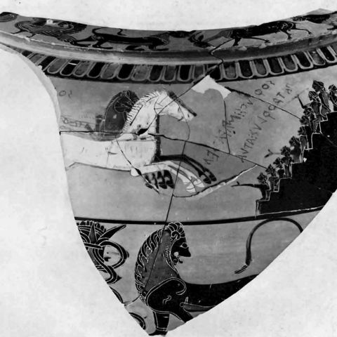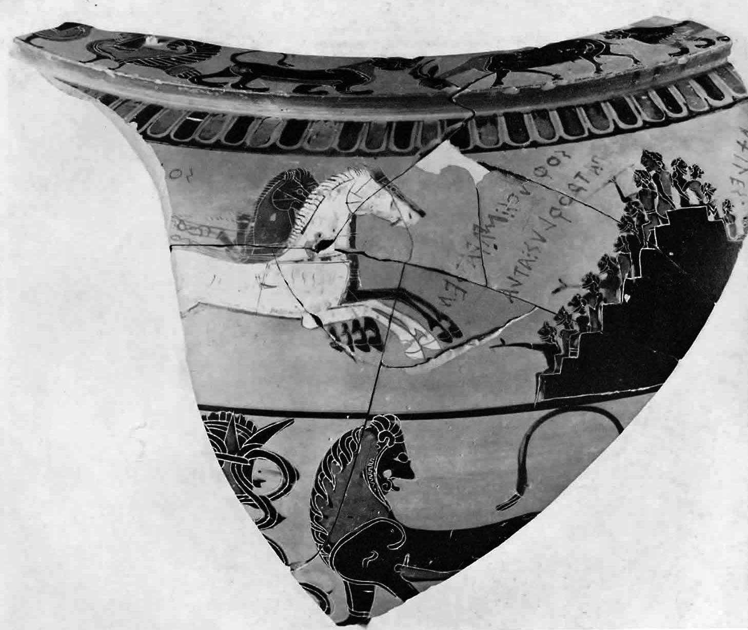 Ανάμεσα στους συνεχιστές του «ζωγράφου των Γοργόνων» είναι και ο πρώτος Αθηναίος αγγειογράφος του οποίου γνωρίζουμε το όνομα, καθώς έχει υπογράψει κάποια από τα έργα του: ο Σοφίλος. Το όνομα είναι ταιριαστό για έναν τεχνίτη, αφού το επίθετο σοφός δηλώνει στην αρχαία ελληνική αυτόν που κατέχει καλά μια τέχνη, δηλαδή τον άξιο και ικανό δημιουργό. Την υπογραφή του Σοφίλου (Σοφίλος ἔγραφσεν) τη διαβάζουμε στα θραύσματα ενός λέβητα από τα Φάρσαλα της Θεσσαλίας, που φυλάσσεται σήμερα στο Εθνικό Αρχαιολογικό Μουσείο και χρονολογείται γύρω στο 580 π.Χ. (εικ. 61). Ενδιαφέρον έχει η αποσπασματικά σωζόμενη παράσταση του αγγείου, όπου διακρίνουμε μια σκηνή αρματοδρομίας και θεατές καθισμένους σε έδρανα να φωνάζουν και να χειρονομούν ενθαρρύνοντας τους ηνιόχους και τα άλογά τους. Μια επιγραφή με ιδιότυπη ορθογραφία (Πατροκλῦς [= Πατροκλέους] ἆτλα) δίπλα στην υπογραφή του αγγειογράφου μας πληροφορεί ότι το θέμα είναι παρμένο από την Ιλιάδα: είναι οι αγώνες (ἆθλα) που οργάνωσε ο Αχιλλέας προς τιμήν του φίλου του Πατρόκλου, τον οποίο ο Έκτορας σκότωσε στη μάχη.
