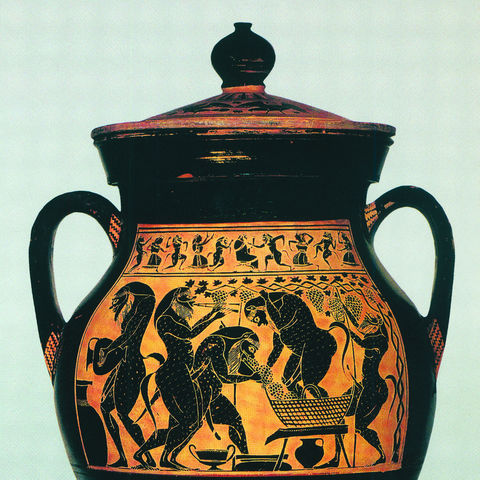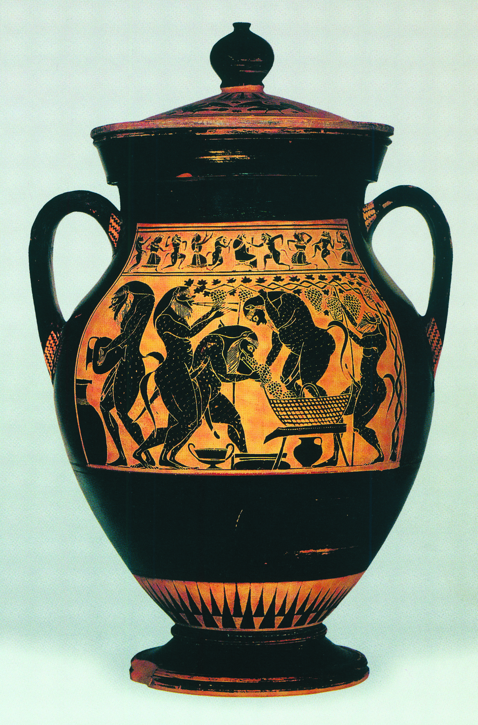 Στο τρίτο τέταρτο του 6ου αιώνα π.Χ. τοποθετείται η δράση των δύο σημαντικότερων αγγειογράφων του αττικού μελανόμορφου ρυθμού, του «ζωγράφου του Άμαση» και του Εξηκία. Το όνομα του πρώτου μάς είναι άγνωστο, καθώς δεν έχει υπογράψει κανένα από τα σωζόμενα έργα του, και γι᾽ αυτό τον αποκαλούμε «ζωγράφο του Άμαση» από τον κεραμέα του οποίου διακοσμούσε τα αγγεία. Το όνομα Άμασις είναι αιγυπτιακό και το είχε ένας φαραώ του 6ου αιώνα που είχε στενές σχέσεις με την Ελλάδα· ήταν μάλιστα, σύμφωνα με τον Ηρόδοτο, φίλος του τυράννου της Σάμου Πολυκράτη. Δεν ξέρουμε αν το όνομα του κεραμέα Άμαση δηλώνει ότι ο κάτοχός του είχε αιγυπτιακή καταγωγή ή σχέσεις με την Αίγυπτο. Οπωσδήποτε όμως το ρεπερτόριο του ζωγράφου που διακοσμούσε τα αγγεία του ήταν αθηναϊκό. Παράδειγμα είναι ένας αμφορέας από την Ετρουρία (σήμερα στο Würzburg της Γερμανίας) με διονυσιακά θέματα, ο οποίος χρονολογείται γύρω στο 540 π.Χ. (εικ. 67). Στη μια όψη, που δεν σώζεται καλά, εικονίζεται ο ίδιος ο Διόνυσος, σε κατάσταση ευθυμίας, να χορεύει με τη συνοδεία αυλού που παίζει ένας σάτυρος· ένας άλλος σάτυρος γεμίζει με κρασί το ποτήρι (κάνθαρο) του θεού από ένα ασκί. Στην άλλη όψη πέντε σάτυροι ασχολούνται με την παραγωγή του ποτού που χάρισε ο Διόνυσος στους ανθρώπους: ο ένας πατάει τα σταφύλια που ρίχνει στο πατητήρι ο σύντροφός του, υπό τον ήχο του αυλού που παίζει ένας τρίτος· ο τέταρτος γεμίζει ένα πιθάρι, ενώ ένας πέμπτος, πίσω τους, χορεύει. Η σκηνή δεν είναι μυθολογική, παρόλο που οι μορφές ανήκουν στη σφαίρα του μύθου. Το ενδιαφέρον είναι ότι οι σάτυροι εκτελούν ανθρώπινες εργασίες, που όμως σχετίζονται με τη φύση τους. Όσο για τον Διόνυσο, δοκιμάζει ο ίδιος το δώρο του προς τους ανθρώπους, το κρασί, και υφίσταται τις συνέπειες από την κατανάλωσή του. Ο ανθρώπινος και ο θεϊκός κόσμος πλησιάζουν και σχεδόν ταυτίζονται με τη βοήθεια του θεϊκού ποτού που διώχνει τη λύπη και φέρνει τη χαρά.