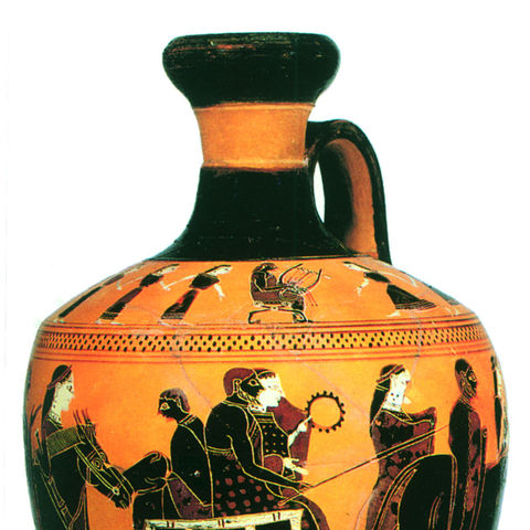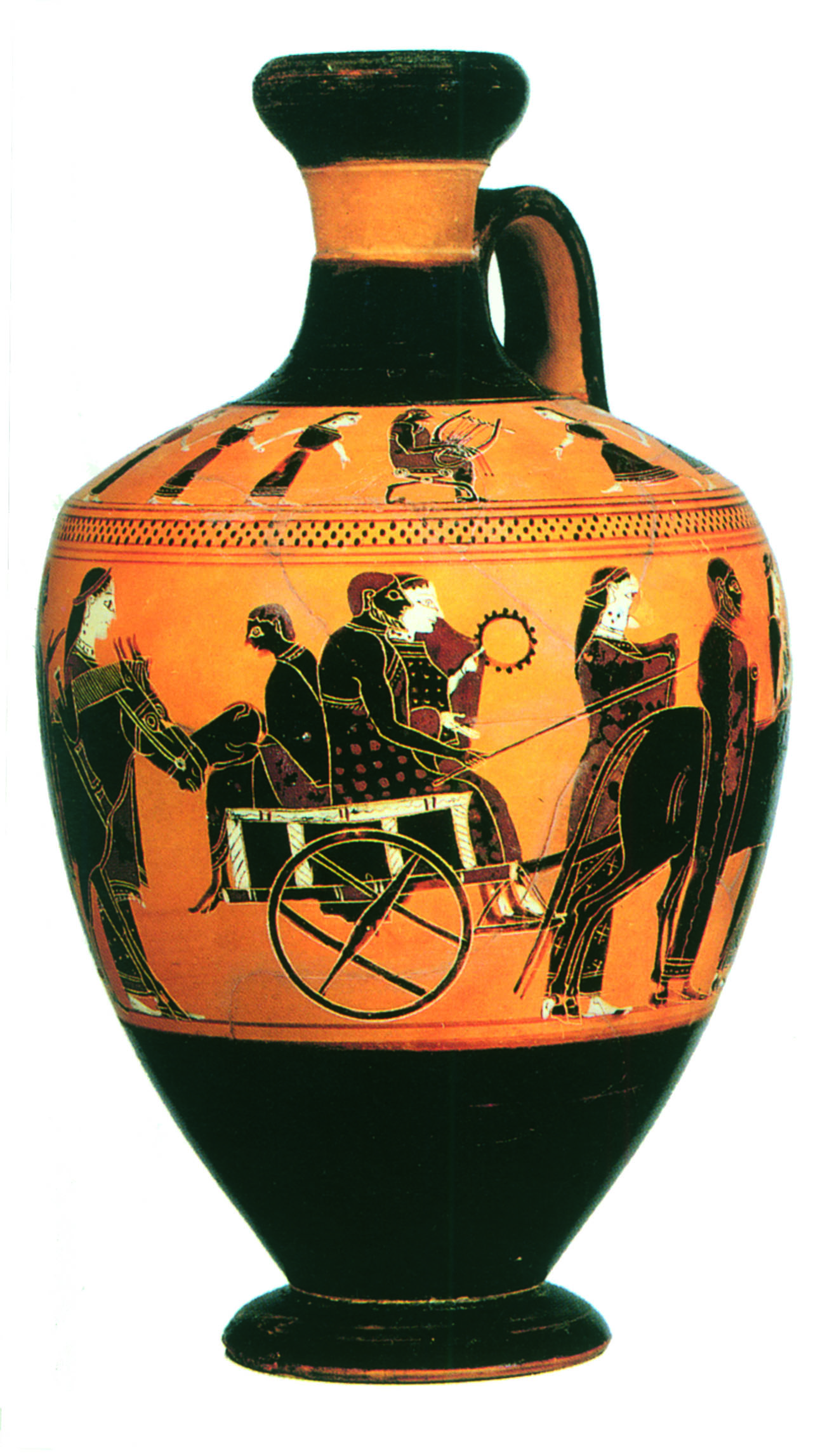 Ακόμη πιο κοντά στη ζωή των ανθρώπων της εποχής μάς φέρνει η παράσταση μιας ληκύθου (μικρού αγγείου για μυρωμένο λάδι) του ίδιου ζωγράφου από έναν τάφο στη Βάρη της Αττικής, σήμερα στη Νέα Υόρκη (εικ. 68). Εδώ βλέπουμε μια γαμήλια πομπή, με τον γαμπρό και τη νύφη να πηγαίνουν μπροστά, καθισμένοι σε ένα αμάξι που το σέρνουν μουλάρια (μια απήνη), και να κατευθύνονται προς την πόρτα του σπιτιού του γαμπρού. Η νύφη κρατάει στεφάνι και ανασηκώνει την άκρη του ιματίου της, αποκαλύπτοντας συμβολικά το πρόσωπό της στον άνδρα της. Πίσω τους, πλάτη με πλάτη, κάθεται ένας παράνυμφος (πάροχος) με ένα ρούχο στα γόνατά του. Η παράσταση δεν είναι συνηθισμένη και το αγγείο ίσως ήταν ειδική παραγγελία της νεκρής, που τοποθετήθηκε ως κτέρισμα στον τάφο της. Την άποψη αυτή ενισχύει η ύπαρξη μιας όμοιας ληκύθου από τον ίδιο τάφο, στην οποία εικονίζονται γυναίκες που υφαίνουν.