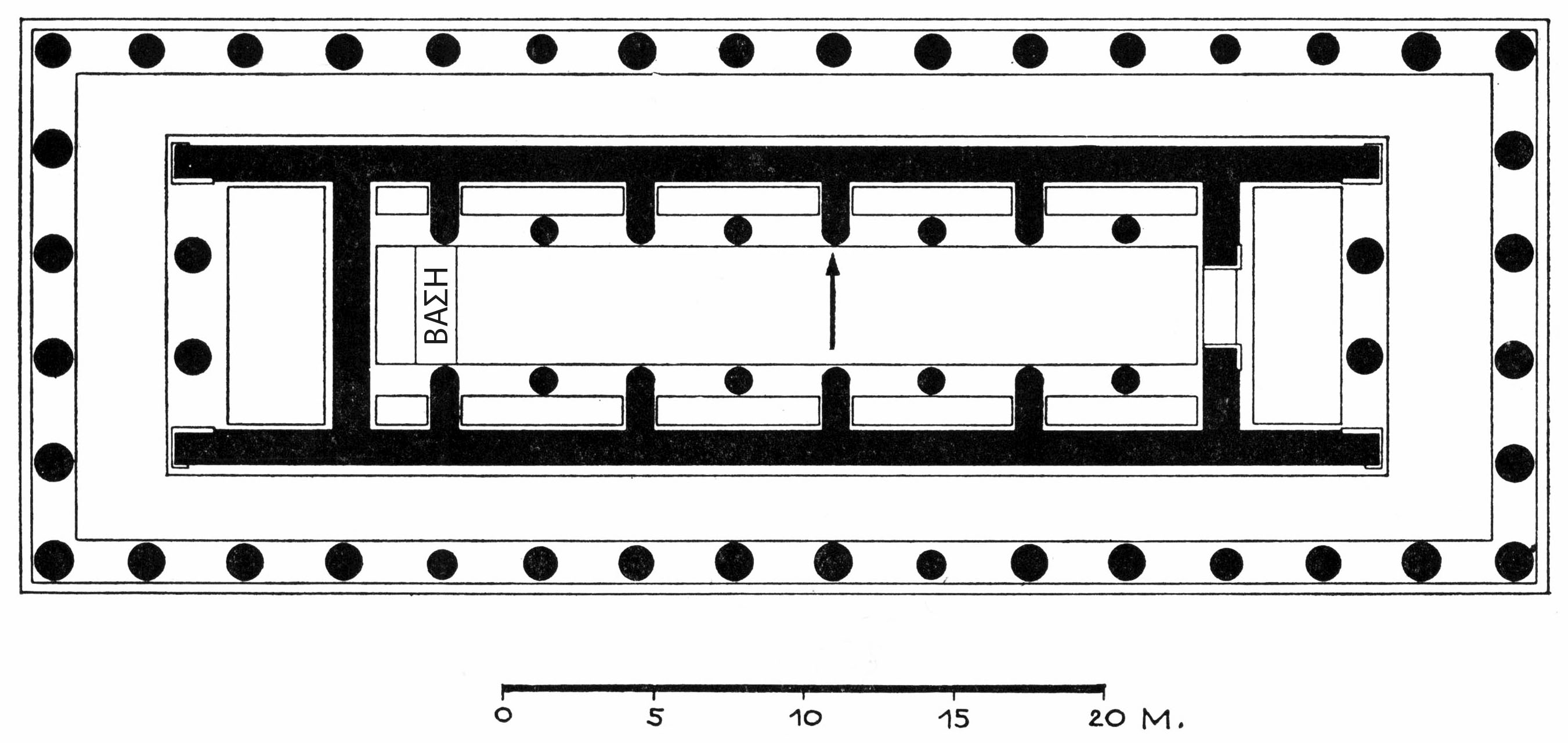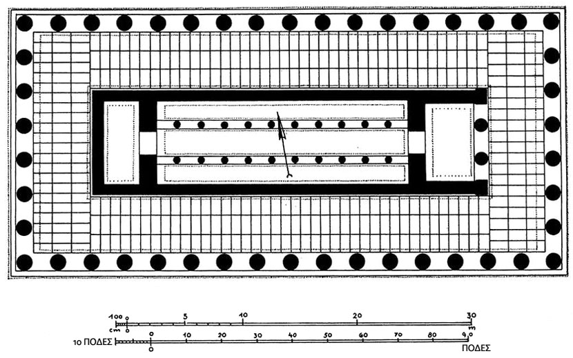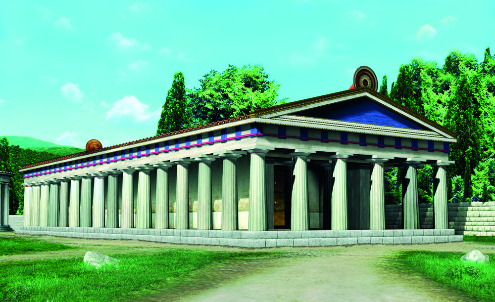 Στην πραγματικότητα, η λίθινη μνημειακή αρχιτεκτονική είναι μεταφορά στον λίθο της παλαιότερης αρχιτεκτονικής που χρησιμοποιούσε ελαφρύτερα υλικά, το ξύλο και τον πηλό. Αυτή την αρχιτεκτονική την είδαμε στον ναό του Θέρμου (εικ. 43). Η αλλαγή άρχισε να συντελείται στο τέλος του 7ου αιώνα π.Χ. Η λίθινη αρχιτεκτονική επικράτησε σχετικά γρήγορα στη διάρκεια του 6ου αιώνα και έκανε τα μνημειακά κτήρια (και ειδικότερα τους ναούς) πολύ ανθεκτικότερα στον χρόνο. Υπάρχει όμως ένα τουλάχιστον παράδειγμα ναού στον οποίο η αντικατάσταση του ξύλου από τον λίθο ήταν βαθμιαία και κράτησε αιώνες: ο ναός της Ήρας στην Ολυμπία (εικ. 72), που χρονολογείται στο τέλος του 7ου ή στις αρχές του 6ου αιώνα π.Χ. Φαίνεται πως ο ναός ήταν αρχικά αφιερωμένος στον Δία και συνδέθηκε με τη λατρεία της Ήρας μετά την κατασκευή του νέου ναού του Δία τον 5ο αιώνα π.Χ. Ο ναός της Ήρας στην Ολυμπία (εικ. 73) ήταν ένας από τους μεγαλύτερους της εποχής του στην Ελλάδα (εξωτερικές διαστάσεις: 18,75 m χ 50 m). Το κυρίως κτίσμα αποτελούνταν από μια μεγάλη μακρόστενη αίθουσα (τον σηκό) με είσοδο από την ανατολική στενή πλευρά, όπου υπήρχε πρόδομος με δύο κίονες ανάμεσα σε παραστάδες, ενώ στα δυτικά οπισθόδομος που είχε όμοια διαμόρφωση με τον πρόδομο. Ο σηκός είχε εσωτερικά δύο σειρές από ξύλινους κίονες σε δύο επίπεδα· κάθε δεύτερος κίονας ενωνόταν με τον τοίχο του σηκού με ένα εγκάρσιο τοιχίο, σχηματίζοντας μια σειρά από κόγχες. Για την κατασκευή των τοίχων είχαν χρησιμοποιηθεί στο κάτω μέρος μεγάλοι ορθογώνιοι πωρόλιθοι και πιο πάνω ωμές πλίνθοι με ξυλοδεσιές. Ολόκληρη η ανωδομή και η στέγη ήταν από ξύλο και διακοσμούνταν εξωτερικά με ψημένες πήλινες πλάκες. Οι κίονες του πτερού που περιέβαλλαν το κτίσμα εξωτερικά (έξι στις στενές και δεκαέξι στις μακρές πλευρές) ήταν αρχικά ξύλινοι και, καθώς σάπιζαν, τους αντικαθιστούσαν με λίθινους. Έτσι, οι κίονες του Ηραίου της Ολυμπίας δεν είναι όμοιοι μεταξύ τους (στην κάτοψη, εικ. 72, διακρίνεται ότι έχουν διαφορετικό πάχος). Αυτό μας δίνει μια εικόνα της εξέλιξης του δωρικού κίονα. Όταν ο περιηγητής Παυσανίας επισκέφθηκε το ιερό της Ολυμπίας στα μέσα του 2ου αιώνα μ.Χ., εφτάμισι αιώνες μετά την κατασκευή του, ένας από τους δύο κίονες του οπισθόδομου ήταν ακόμη ξύλινος.