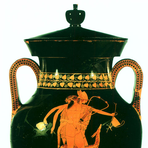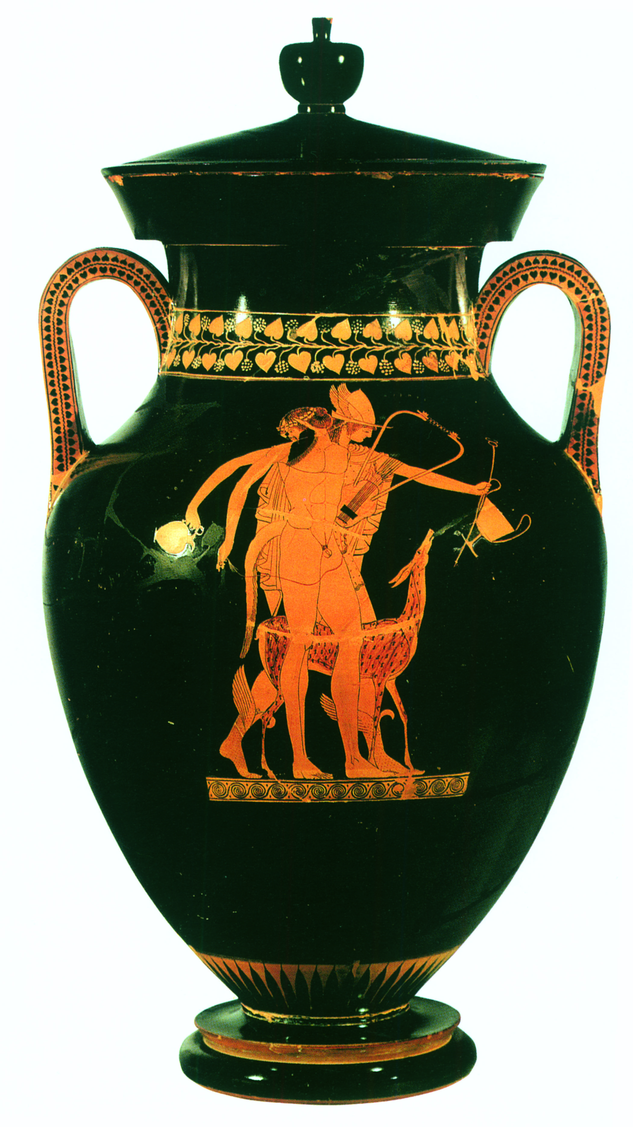Αυτή η σπουδή της κίνησης είναι σημάδι μεγάλης αλλαγής στην τέχνη, που θα τη συναντήσουμε και στην πλαστική. Είναι προφανές ότι στις αρχές του 5ου αιώνα π.Χ. οι καλλιτέχνες αποδεσμεύτηκαν από τις συμβάσεις της αρχαϊκής εποχής και τόλμησαν κάτι εντελώς καινούργιο, να αποδώσουν τη δυναμική του ζωντανού και κινημένου ανθρώπινου σώματος. Η νέα αυτή προσέγγιση προϋποθέτει γνώσεις ανατομίας και μαθηματικών αλλά και διάθεση για πειραματισμούς και καινοτόμες λύσεις. Ο χαρακτήρας της παράστασης είναι διονυσιακός, αν και ο ίδιος ο Διόνυσος απουσιάζει. Ο ηλικιωμένος (όπως δείχνει το φαλακρό του μέτωπο) σάτυρος ανήκει στην ακολουθία του θεού του κρασιού και η περίτεχνη κόμμωση του, το στεφάνι από κισσό και η βάρβιτος που παίζει δείχνουν ότι συμμετέχει σε συμπόσιο. Στο συμπόσιο σπεύδει και ο Ερμής, για να προσφέρει σπονδή στον Διόνυσο. Το ζαρκάδι δείχνει ότι η σκηνή τοποθετείται στην άγρια φύση, όπου οι λατρευτές του Διονύσου συνήθιζαν να κάνουν τελετές προς τιμήν του. Με τον Διόνυσο σχετίζεται και το κλαδί με τα συμμετρικά κισσόφυλα και τους κορύμβους, που διακοσμεί τον λαιμό του αμφορέα.