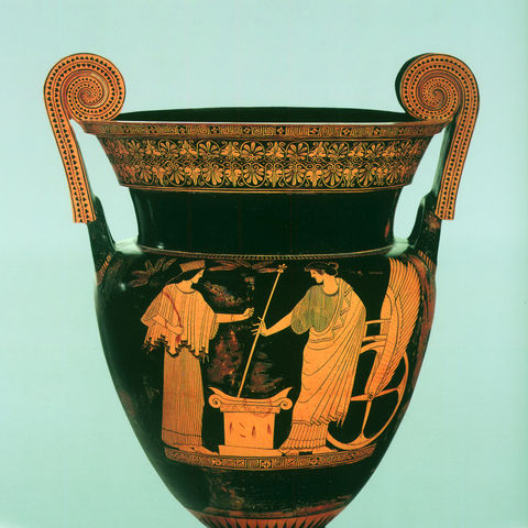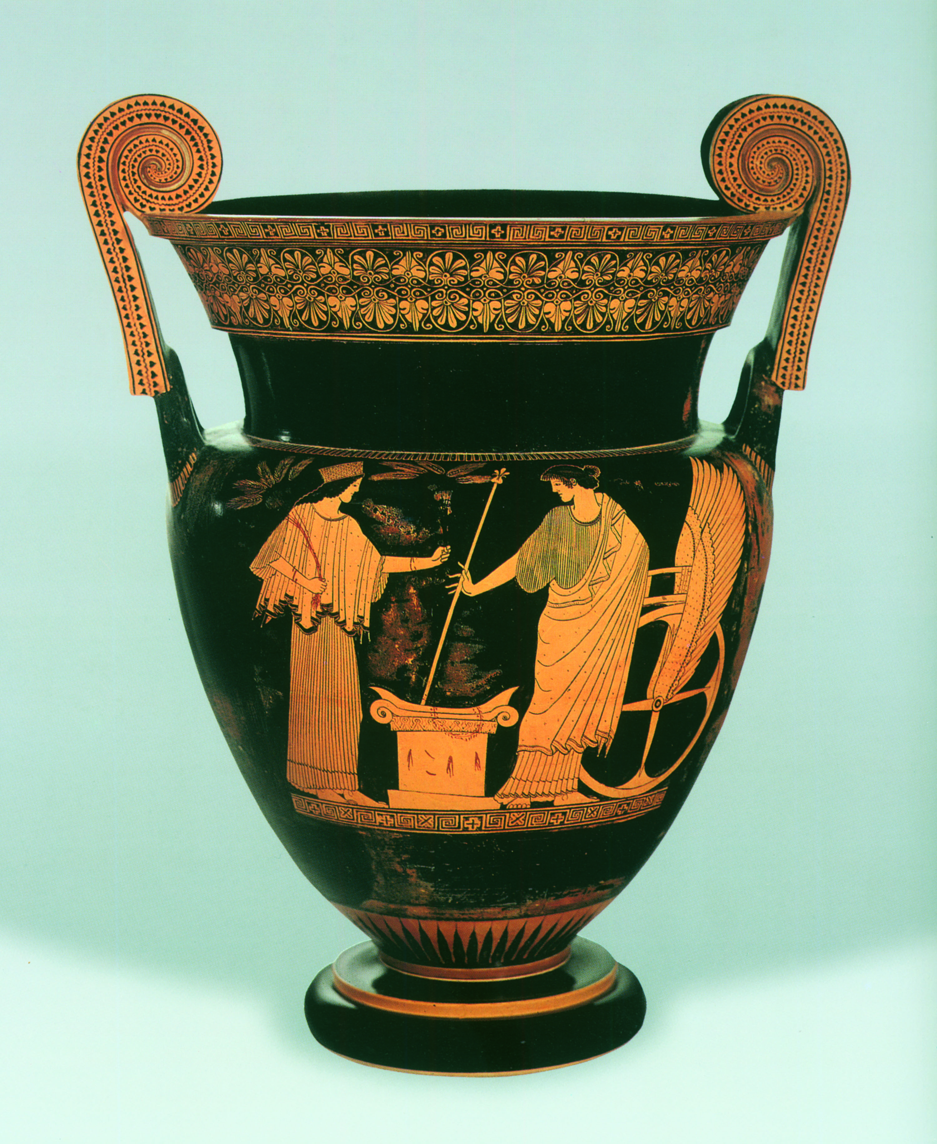 Έργο του «ζωγράφου του Βερολίνου» είναι η διακόσμηση ενός ελικωτού κρατήρα που βρίσκεται σήμερα στην Καρλσρούη της Γερμανίας (εικ. 149). Εδώ το θέμα της κύριας όψης είναι παρμένο από τη λατρεία της Δήμητρας, που κέντρο της ήταν η Ελευσίνα. Από εκεί, όπως πίστευαν οι Αθηναίοι, ξεκίνησε η καλλιέργεια του σιταριού, την οποία μετέδωσε στους ανθρώπους η Δήμητρα, στέλνοντας τον Τριπτόλεμο, τον γιο του βασιλιά της Ελευσίνας Κελεού και της Μετανείρας, να μεταφέρει τα στάχυα πάνω σε φτερωτό άρμα. Στην παράσταση βλέπουμε τη θεά ντυμένη με χιτώνα και πέπλο, με πόλο στο κεφάλι, να παραδίδει τα στάχυα στον Τριπτόλεμο, που φοράει πλούσια ρούχα (χιτώνα και ιμάτιο), έχει τα μαλλιά του προσεκτικά χτενισμένα και, σαν βασιλόπουλο που είναι, κρατάει σκήπτρο στο δεξί χέρι. Η σκηνή διαδραματίζεται στο ιερό της θεάς, όπως δείχνει ο βωμός ανάμεσα στα δύο πρόσωπα με ίχνη από το αίμα των θυσιασμένων ζώων στις πλευρές του και ένα στεφάνι από φύλλα επάνω του. Και εδώ οι μορφές διαφέρουν ως προς τη στάση: Η Δήμητρα στέκεται ήρεμα με ελαφρά λυγισμένο το αριστερό σκέλος και προσφέρει τα στάχυα, ενώ ο Τριπτόλεμος, έτοιμος να αναχωρήσει, στρέφεται προς τη θεά για να δεχτεί το δώρο της. Αξιοπρόσεκτη είναι η διακόσμηση του λαιμού του κρατήρα με συμμετρικά ανθέμια και άνθη λωτού, και των ελικωτών λαβών με κισσόφυλλα.