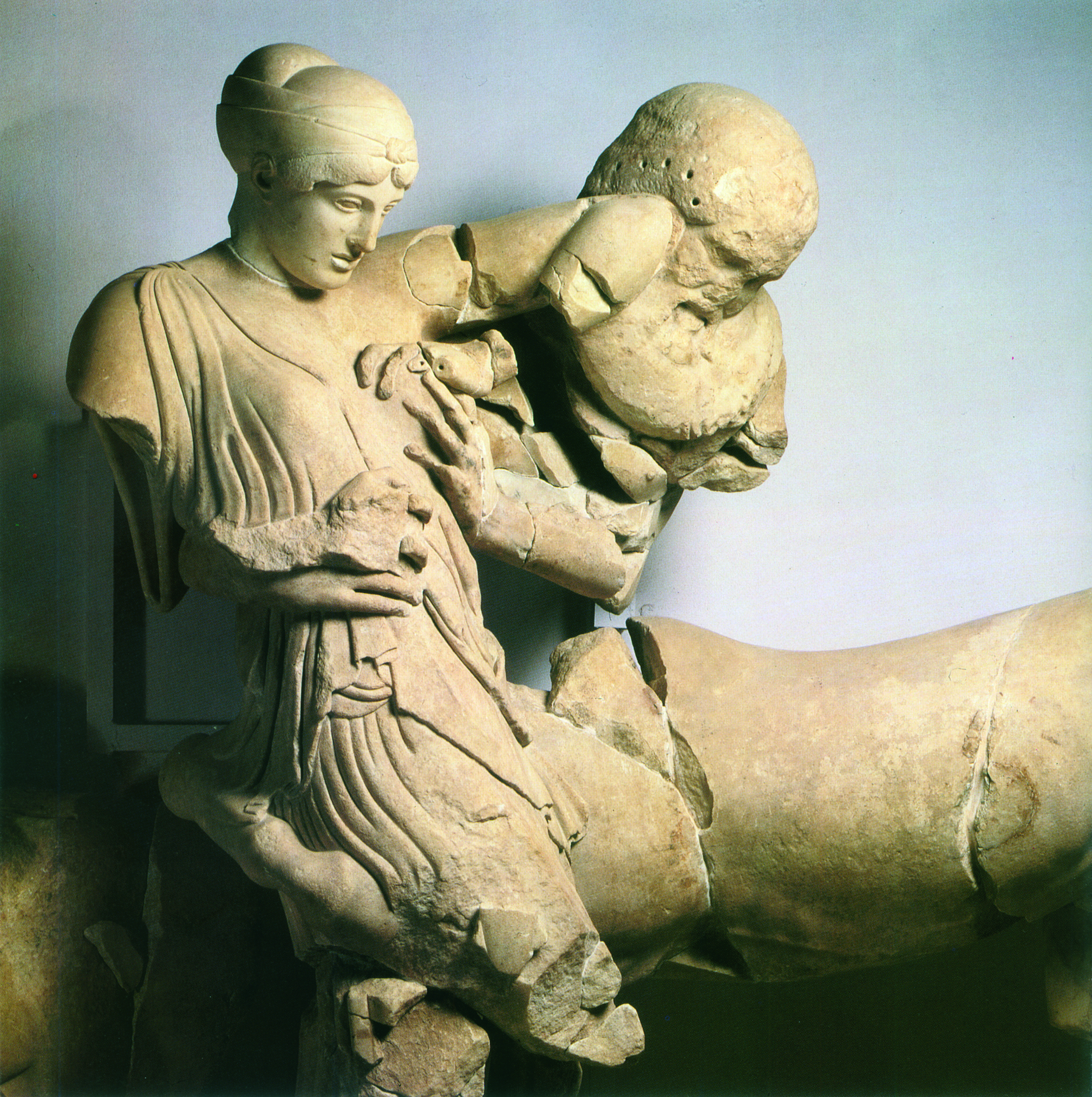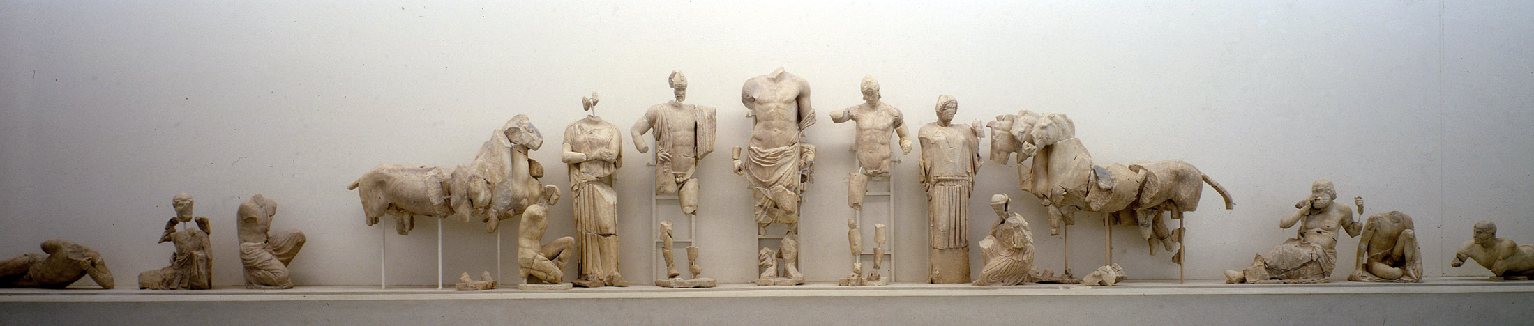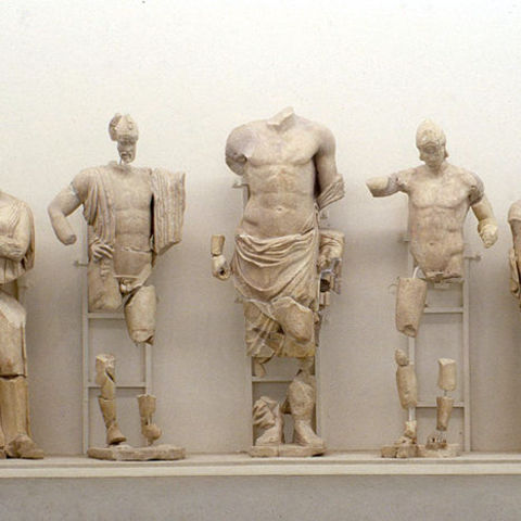 Ακόμη πιο σαφής είναι αυτή η τάση στα γλυπτά των αετωμάτων. Στο ανατολικό αέτωμα εικονίζεται ένας τοπικός μύθος, η αρματοδρομία του Πέλοπα και του Οινόμαου (εικ. 167). Ο Πέλοπας, που έδωσε το όνομά του στην Πελοπόννησο, ήταν ένας από τους πολλούς υποψήφιους γαμπρούς που είχαν ζητήσει το χέρι της Ιπποδάμειας, της όμορφης κόρης του βασιλιά της Πίσας Οινόμαου. Αλλά ο Οινόμαος (που είχε πάρει έναν χρησμό, σύμφωνα με τον οποίο ο γαμπρός του θα τον σκότωνε) είχε θέσει όρο ότι, για να παντρευτεί κάποιος την κόρη του, έπρεπε να τον νικήσει σε αγώνα αρματοδρομίας· αν ο υποψήφιος γαμπρός έχανε, η τιμωρία του ήταν ο θάνατος. Στην πραγματικότητα ο Οινόμαος ήταν αδύνατο να χάσει, γιατί τα άλογά του, δώρο του Άρη, ήταν ανίκητα. Ανάμεσα στους μνηστήρες ήταν και ο Πέλοπας, ο οποίος κατέφυγε σε ένα τέχνασμα: ζήτησε από την Ιπποδάμεια, που τον είχε ερωτευθεί, να πείσει τον ηνίοχο του Οινόμαου, τον Μυρτίλο, να μην στερεώσει καλά τους τροχούς του άρματός του και έτσι στη διάρκεια της αρματοδρομίας το άρμα διαλύθηκε και ο Οινόμαος σκοτώθηκε. Στη σύνθεση του αετώματος εικονίζεται στη μέση ο Δίας, που καθορίζει τη μοίρα των ανθρώπων· στα δεξιά του είναι ο νεαρός Πέλοπας με τη μνηστή του την Ιπποδάμεια και στα αριστερά του ο ηλικιωμένος Οινόμαος με τη γυναίκα του τη Στερόπη. Μετά τους πρωταγωνιστές βλέπουμε τα δύο άρματα με τους ηνιόχους, δύο ηλικιωμένους άνδρες που παρακολουθούν την προετοιμασία του αγώνα καθιστοί, και στα άκρα δύο ξαπλωμένες ανδρικές μορφές, που ενσαρκώνουν τους δύο ποταμούς της Ολυμπίας, τον Αλφειό και τον Κλάδεο.