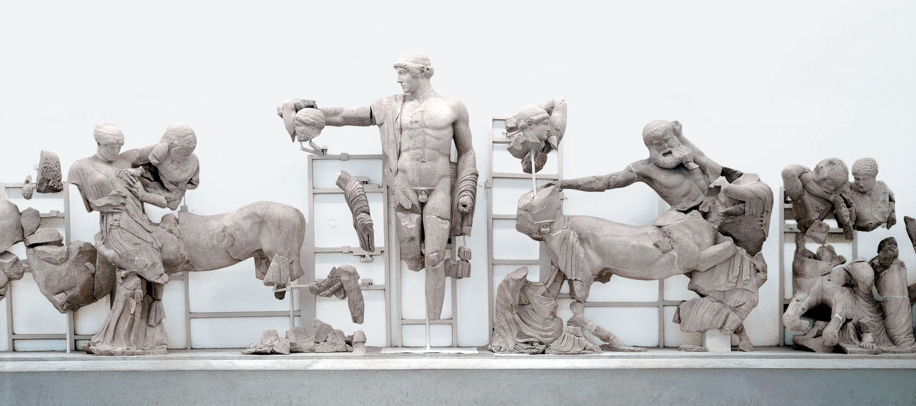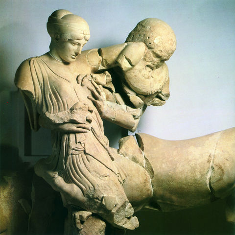Στο δυτικό αέτωμα εικονίζεται η θεσσαλική Κενταυρομαχία (εικ. 168). Στη Θεσσαλία ζούσαν οι Λαπίθες, και στον γάμο ενός από αυτούς, του Πειρίθου, ήταν προσκεκλημένοι και οι Κένταυροι, καθώς ήταν συγγενείς της νύφης. Στο γλέντι όμως που ακολούθησε οι Κένταυροι μέθυσαν και επιτέθηκαν στις γυναίκες των Λαπιθών για να τις βιάσουν. Τότε οι Λαπίθες συνεπλάκησαν μαζί τους και τους έδιωξαν, αφού σκότωσαν αρκετούς. Στη μάχη συμμετείχε και ο Αθηναίος Θησέας, που ήταν φίλος του Πειρίθου. Οι Κένταυροι δεν έχουν ακόμη ηττηθεί, είναι όμως σαφές ότι δεν θα καταφέρουν να επικρατήσουν. Στο κέντρο της παράστασης δεσπόζει η επιβλητική μορφή του Απόλλωνα, που απλώνει το χέρι για να σταματήσει το κακό, ενώ δεξιά και αριστερά του μάχονται οι δύο πρωταγωνιστές, ο Πειρίθους και ο Θησέας. Η μάχη με τους Κενταύρους συμβόλιζε στα μάτια των αρχαίων Ελλήνων τη νίκη του πολιτισμού και της σωφροσύνης ενάντια στην κτηνώδη βία.