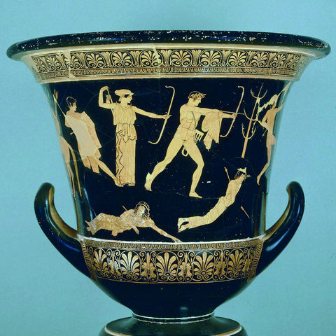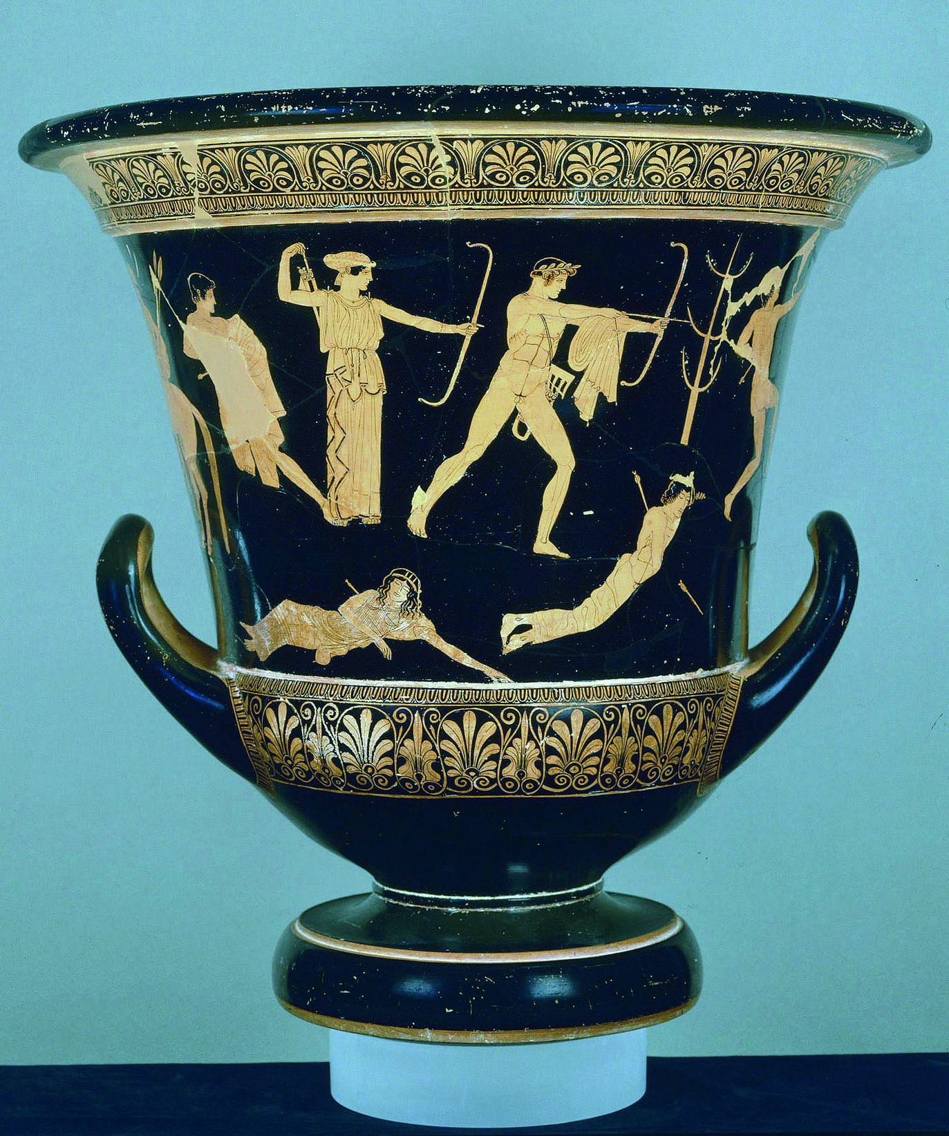 • 190. Καλυκωτός κρατήρας του “ζωγράφου των Νιοβιδών”: Ο Απόλλων και η Άρτεμη σκοτώνουν τα παιδιά της Νιόβης, 460-450 π.Χ. Παρίσι, Λούβρο.