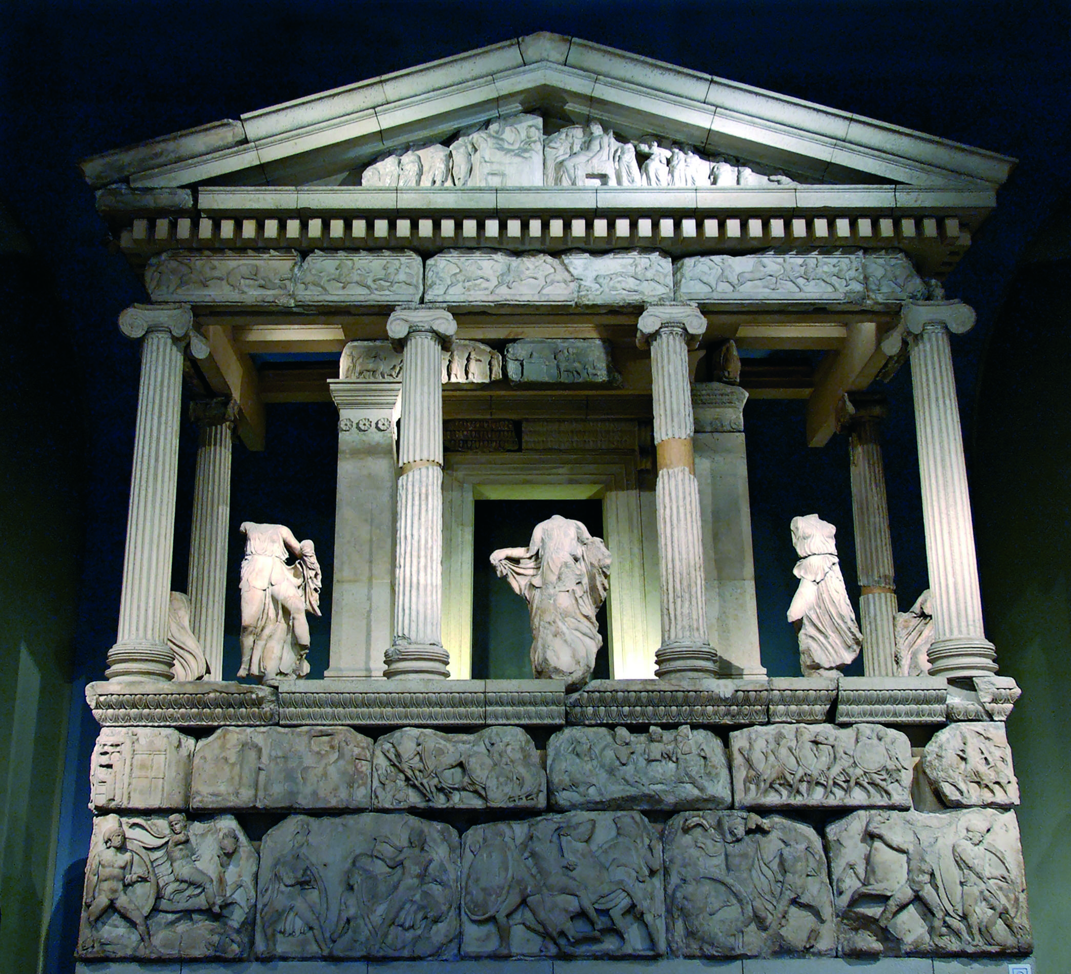 Στο τέλος όμως του 5ου ή (το πιθανότερο) στις αρχές του 4ου αιώνα π.Χ. ιδρύθηκε στην Ξάνθο, την πρωτεύουσα της Λυκίας, ένα επιβλητικό ταφικό μνημείο, ένα μαρμάρινο οικοδόμημα με τη μορφή ιωνικού ναού, που υψώνεται επάνω σε ένα ψηλό πόδιο (εικ. 245). Το μνημείο αυτό είναι γνωστό με το όνομα μνημείο των Νηρηίδων και βρίσκεται σήμερα στο Βρετανικό Μουσείο. Είναι πολύ πιθανόν ότι το μνημείο των Νηρηίδων ήταν ο τάφος του δυνάστη Αρβίνα, ο οποίος, όπως μαθαίνουμε από μια δίγλωσση επιγραφή (στην ελληνική και στη λυκιακή γλώσσα), χαραγμένη σε έναν πεσσό με ανάγλυφες παραστάσεις που χρονολογείται στην περίοδο 430-410 π.Χ., κατόρθωσε με μια σειρά από πολεμικές επιχειρήσεις να ενώσει τη Λυκία. Το μνημείο έχει πλούσιο γλυπτό διάκοσμο που προβάλλει τις πολεμικές επιτυχίες, την ισχυρή εξουσία και τη δόξα του ηγεμόνα. Το πόδιο κοσμείται με δύο επάλληλες ζωφόρους διαφορετικού ύψους, διακοσμημένες με ανάγλυφες παραστάσεις. Στην κάτω ζωφόρο, που είναι μεγαλύτερη, εικονίζονται μάχες με πεζούς και ιππείς, ενώ στην επάνω, που έχει περίπου το μισό ύψος, διακρίνουμε στις δύο πλευρές πολιορκίες πόλεων και στην τρίτη έναν δυνάστη που δέχεται καθισμένος μια διπλωματική αντιπροσωπεία, πιθανότατα αντιπάλων που θέλουν να διαπραγματευτούν την παράδοσή τους. Στη θέση του επιστυλίου επάνω από τους κίονες υπάρχει μια ζωφόρος με παραστάσεις έφιππου κυνηγιού, μαχών, καθώς και μιας πομπής με άνδρες που φέρνουν δώρα. Από τη ζωφόρο που κοσμεί το επάνω μέρος του εξωτερικού τοίχου του σηκού σώζεται καλά ένα μόνο τμήμα, στο οποίο εικονίζεται σκηνή συμποσίου. Στο ανατολικό αέτωμα μια ανάγλυφη παράσταση δείχνει τον ηγεμόνα και τη σύζυγό του καθιστούς, περιτριγυρισμένους από τους υπηρέτες τους. Το πιο ενδιαφέρον στοιχείο του γλυπτού διακόσμου είναι τα αγάλματα γυναικών που τρέχουν ανάμεσα στους κίονες (εικ. 246)· η έντονη κίνησή τους κάνει τα ενδύματά τους να ανεμίζουν και να σχηματίζουν πλούσιες πτυχές, που κολλούν στο σώμα. Οι μορφές αυτές εικονίζουν πιθανότατα Νηρηίδες, θεές της θάλασσας και αδελφές της Θέτιδας, της μητέρας του Αχιλλέα. Ήδη από τον 5ο αιώνα π.Χ. (και ίσως από ακόμη παλαιότερα) οι Έλληνες πίστευαν ότι οι σπουδαίοι άνδρες, όταν πέθαιναν, δεν πήγαιναν στον Άδη, αλλά στα Νησιά των Μακάρων, πέρα από τη θάλασσα, όπου ζούσαν αιώνια ευτυχισμένοι· σε αυτή την τελευταία κατοικία τούς συνόδευαν οι Νηρηίδες. Στο μνημείο δούλεψαν δύο τουλάχιστον εργαστήρια με Έλληνες γλύπτες, οι οποίοι είχαν δεχτεί έντονα την επίδραση του «πλούσιου ρυθμού».