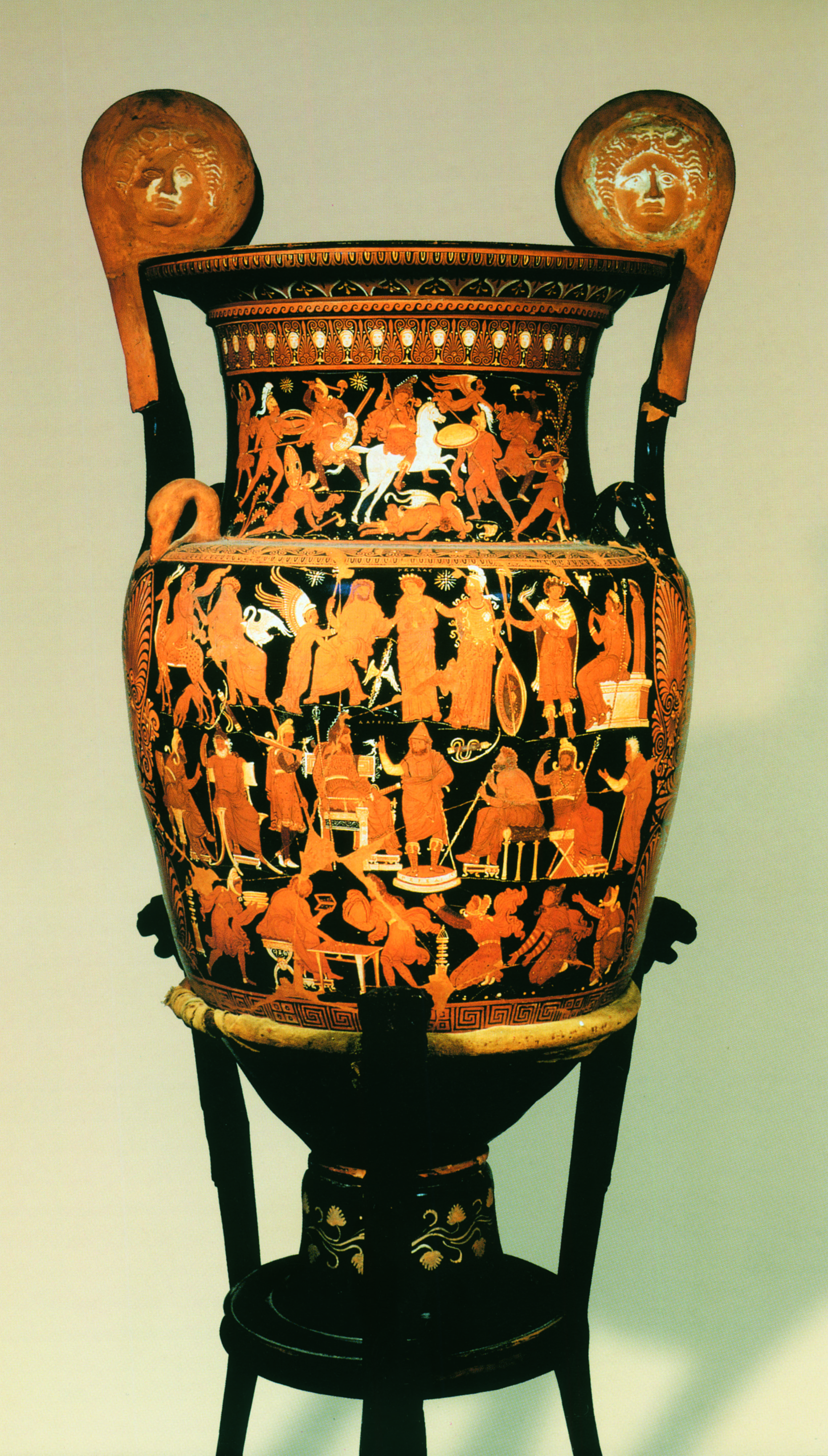 Ένα από τα πιο εντυπωσιακά αγγεία του απουλικού εργαστηρίου είναι ο μεγάλων διαστάσεων ελικωτός κρατήρας (1,38 m), που είναι γνωστός ως κρατήρας του Δαρείου από την παράσταση στην κυρία όψη του (εικ. 254). Το αγγείο, που χρονολογείται γύρω στο 330 π.Χ., βρέθηκε στην Canosa της Απουλίας και φυλάσσεται στο Αρχαιολογικό Μουσείο της Νεάπολης. Ο αγγειογράφος ονομάζεται «ζωγράφος του Δαρείου» και οφείλει το όνομά του στον κρατήρα αυτό. Στην πολυπρόσωπη σκηνή της κύριας όψης κυρίαρχη θέση έχει ο βασιλιάς της Περσίας Δαρείος, που εικονίζεται στο κέντρο καθισμένος σε πολυτελή θρόνο με υποπόδιο, κρατώντας σκήπτρο στο δεξί και ξίφος στο αριστερό χέρι, και ταυτίζεται, όπως και άλλες μορφές, με επιγραφή. Μπροστά στον Δαρείο στέκεται ένας γενειοφόρος άνδρας ντυμένος με χιτώνα και ιμάτιο, με κωνικό πίλο στο κεφάλι, ψηλά υποδήματα οδοιπόρου στα πόδια και μπαστούνι στο αριστερό χέρι: είναι ένας αγγελιοφόρος που μεταφέρει μια είδηση στον Πέρση βασιλιά, όπως δείχνει το προτεταμένο δεξί του χέρι με τα υψωμένα τρία δάχτυλα· η έκφραση του προσώπου του δείχνει ότι τα νέα είναι δυσάρεστα. Ο αγγελιοφόρος πατάει επάνω σε ένα κυκλικό βάθρο με δύο βαθμίδες που φέρει την επιγραφή ΠΕΡΣΑΙ. Είναι πολύ πιθανόν ότι η παράσταση εμπνέεται από ένα θεατρικό έργο με αυτό τον τίτλο, που δεν μπορεί πάντως να είναι η γνωστή τραγωδία του Αισχύλου. Πίσω από τον Δαρείο εικονίζεται ένας σωματοφύλακας, που κρατάει δύο δόρατα και μάχαιρα. Από τις υπόλοιπες μορφές της μεσαίας ζώνης τέσσερις είναι ώριμοι άνδρες καθισμένοι ανά δύο δεξιά και αριστερά του Δαρείου, πιθανότατα σύμβουλοί του και αξιωματούχοι. Αξίζει να σημειώσουμε ότι μόνο οι δύο είναι Πέρσες, όπως δείχνει η ενδυμασία τους, ενώ οι άλλοι δύο είναι Έλληνες. Η τελευταία μορφή δεξιά είναι ένας ηλικιωμένος άνδρας που στέκεται ακουμπώντας σε ένα ραβδί και προτείνει το δεξί χέρι. Στην κάτω ζώνη εικονίζεται ένας ιματιοφόρος άνδρας, καθισμένος μπροστά σε ένα τραπέζι, με ένα δίπτυχο πινάκιο με αριθμούς στο αριστερό χέρι. Επάνω στο τραπέζι διακρίνονται ψῆφοι, δηλαδή λευκές πέτρες που χρησιμοποιούσαν οι αρχαίοι για να κάνουν πράξεις της αριθμητικής. Δεξιά και αριστερά δύο Ανατολίτες φέρνουν ο ένας σάκο με χρήματα και ο άλλος χρυσά αγγεία, ενώ άλλοι Ανατολίτες γονατίζουν και προτείνουν τα χέρια σε στάση ικεσίας. Είναι σαφές ότι οι Ανατολίτες πληρώνουν φόρο και δηλώνουν υποταγή, ενώ ο ιματιοφόρος Έλληνας υπολογίζει και καταγράφει το συνολικό ποσό. Οι μορφές στην επάνω ζώνη είναι θεοί, ενώ δύο άστρα δηλώνουν ότι βρίσκονται στον ουρανό. Στη μέση κάθεται ο Δίας με το σκήπτρο στο χέρι, τον κεραυνό δίπλα του και μια φτερωτή Νίκη μπροστά του. Ο βασιλιάς των θεών στρέφεται προς μια γυναίκα που, όπως δηλώνει η επιγραφή επάνω από το κεφάλι της, είναι η προσωποποιημένη Ελλάδα, την οποία συνοδεύει η Αθηνά ακουμπώντας το δεξί χέρι στον ώμο της. Δεξιότερα η προσωποποίηση της Απάτης, με δάδες στα χέρια, στρέφεται προς την προσωποποίηση της Ασίας, που κάθεται επάνω σε βωμό, πίσω από τον οποίο υψώνεται μια ερμαϊκή στήλη με κεφάλι γυναίκας. Στα αριστερά εικονίζονται η Άρτεμις, καθισμένη σε ελάφι, και ο Απόλλων με το ιερό του πουλί, τον κύκνο.