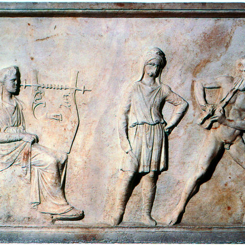 • 286. Μαρμάρινη πλάκα από τη βάση του συντάγματος του Απόλλωνα, της Άρτεμης και της Λητούς στη Μαντίνεια, έργου του Πραξιτέλη: Απόλλων, Σκύθης και Μαρσύας. Αθήνα, Εθνικό Αρχαιολογικό Μουσείο.