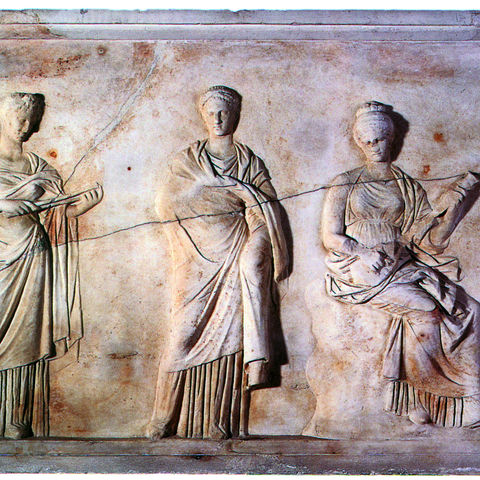• 287. Μαρμάρινη πλάκα από τη βάση του συντάγματος του Απόλλωνα, της Άρτεμης και της Λητούς στη Μαντινεία, έργου του Πραξιτέλη: Τρεις Μούσες. Αθήνα, Εθνικό Αρχαιολογικό Μουσείο.