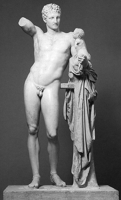 • 285. Σύμπλεγμα του Ερμή και του Διονύσου, έργο του Πραξιτέλη (ή αντίγραφο;). Ολυμπία, Αρχαιολογικό Μουσείο.