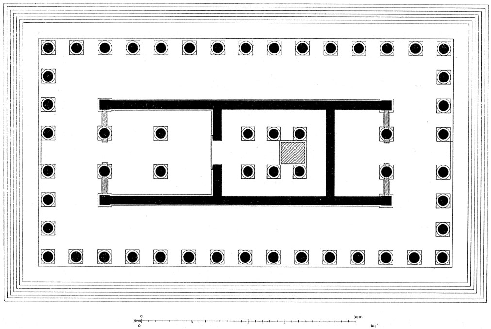Ο Ερμογένης ήταν αυτός που πρώτος επινόησε τον οκτάστυλο ψευδοδίπτερο ναό· αφαίρεσε από τον σύμμετρο δίπτερο ναό τις εσωτερικές κιονοστοιχίες, που περιλαμβάνουν τριάντα οκτώ κίονες, και περιόρισε τη δαπάνη και την απαιτούμενη εργασία. Δημιούργησε με έξοχο τρόπο έναν ευρύχωρο περίπατο δίπλα στο κτήριο, γύρω από τον σηκό. Διαφύλαξε με την κατανομή αυτή το μεγαλείο του όλου έργου και αυτό χωρίς να μειωθεί το κάλλος της όψης και χωρίς να προκαλείται επιθυμία διατήρησης του περιττού που αφαιρέθηκε.