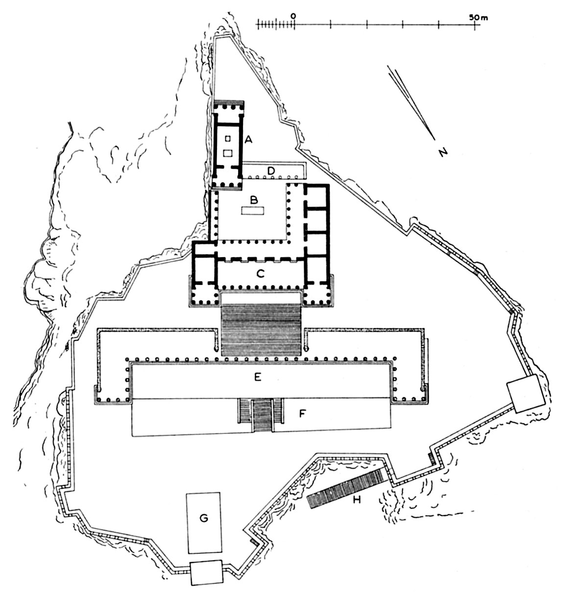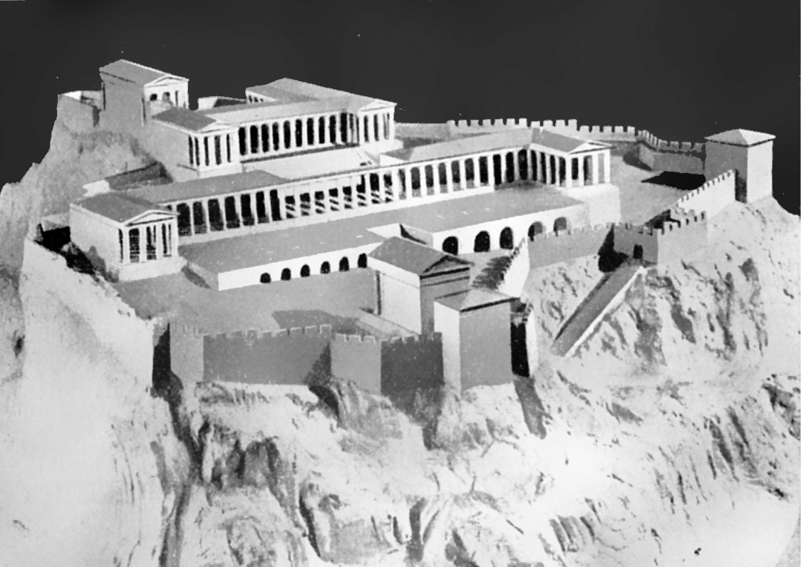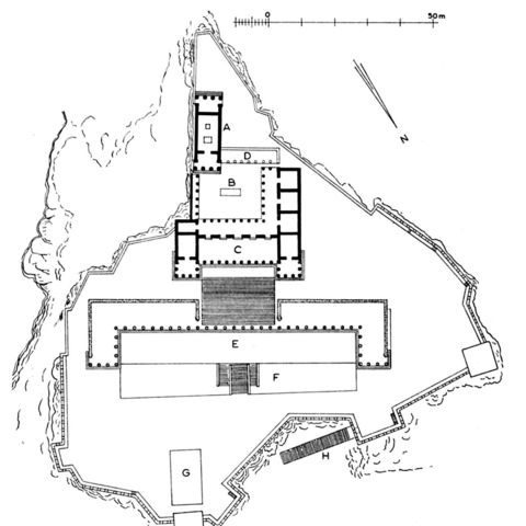 Ακόμη πιο εντυπωσιακή είναι η διαμόρφωση του ιερού της Αθηνάς στη Λίνδο της Ρόδου, όπου ένα επιβλητικό βραχώδες ύψωμα που δεσπόζει επάνω από τη θάλασσα μετατράπηκε στην ελληνιστική εποχή σε αρχιτεκτονική σύνθεση (εικ. 322). Ο αρχαϊκός ναός, που κάηκε το 342 π.Χ., ξαναχτίστηκε στο τέλος του 4ου αιώνα π.Χ. στην ίδια θέση, στην άκρη ενός απόκρημνου βράχου που πέφτει κάθετα στη θάλασσα, και με το ίδιο ακριβώς μακρόστενο σχέδιο (7,75 m x 21,65 m), ως αμφιπρόστυλος δωρικός ναός (εικ. 323, Α). Λίγα χρόνια αργότερα δημιουργήθηκε γύρω από τον βωμό, στα ανατολικά του ναού, μια ευρύχωρη ορθογώνια πλατεία με στοές γύρω γύρω. Στη συμμετρική αυτή πλατεία, αν και όχι στον άξονά της, εντάχθηκε η πρόσοψη του ναού. Η πρόσβαση στην πλατεία γινόταν από την ανατολική πλευρά, απέναντι ακριβώς από τον ναό, μέσα από ένα μνημειακό πρόπυλο που είχε τη μορφή στοάς με προεξέχουσες πτέρυγες (εικ. 323, C). Στο πρόπυλο οδηγούσε μια μεγάλη κλίμακα, ίση σε πλάτος με τη στοά. Στη βάση της κλίμακας χτίστηκε αργότερα, πιθανότατα τον 1ο αιώνα π.Χ., μια δεύτερη, ακόμη μεγαλύτερη στοά που περιβάλλει μια δεύτερη μνημειακή κλίμακα (εικ. 323, Ε). Με τις παρεμβάσεις αυτές η απότομη βραχώδης ακρόπολη έχει μετατραπεί σε αρχιτεκτονικό τοπίο και ο επισκέπτης που πηγαίνει προς την κορυφή φτάνει στον ναό ανεβαίνοντας πολλά φαρδιά σκαλιά και περνώντας μέσα από διαδοχικές στοές χτισμένες σε επάλληλα επίπεδα.