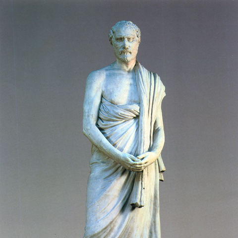 Το 287/286 π.Χ., μετά από πολλές πολιτικές και στρατιωτικές περιπέτειες, οι Αθηναίοι κατάφεραν να απαλλαγούν από την κυριαρχία των Μακεδόνων βασιλέων και να ανακτήσουν την ανεξαρτησία τους· τότε αποφάσισαν να τιμήσουν τον Δημοσθένη, τον άνθρωπο που στη διάρκεια του 4ου αιώνα είχε αγωνιστεί όσο κανένας άλλος εναντίον των Μακεδόνων (κυρίως ως αντίπαλος του Φιλίππου, αργότερα όμως και του Αλεξάνδρου) στην προσπάθειά του να ξαναδώσει στην Αθήνα την παλιά της δύναμη και επιρροή. Ο αγώνας ήταν μάταιος, γιατί η Αθήνα δεν διέθετε ούτε την οικονομική ευρωστία ούτε τη στρατιωτική δύναμη για να επιτύχει έναν τέτοιο στόχο. Αλλά ο Δημοσθένης ήταν ένθερμος πατριώτης και δεινός ρήτορας και συνέπαιρνε με τους λόγους του τους Αθηναίους. Έτσι οι Αθηναίοι, λίγα χρόνια αφού ξανακέρδισαν την ελευθερία τους, το 280 π.Χ., αποφάσισαν να στήσουν στη μέση της Αγοράς έναν ανδριάντα του Δημοσθένη, που είχε πεθάνει εξόριστος το 322 π.Χ. Ο ανδριάντας αυτός, έργο του γλύπτη Πολυεύκτου, μας παραδίδεται σε αντίγραφα (εικ. 332) και εικονίζει τον ρήτορα σε μια στάση περίσκεψης και λύπης, με κατεβασμένο το κεφάλι και σταυρωμένα τα χέρια μπροστά στην κοιλιά. Τη στάση αυτή τη συναντούμε στον 4ο αιώνα π.Χ. σε πενθούσες μορφές σε επιτύμβια μνημεία. Πρόθεση των Αθηναίων ήταν να δείξουν ότι, παρ᾽ όλη την πολιτική ήττα που είχε υποστεί, ο Δημοσθένης παρέμενε ένα φωτεινό παράδειγμα πατριωτισμού και αντίστασης στη μακεδονική κυριαρχία. Αυτήν ακριβώς την ιδέα εξέφραζε το επίγραμμα που ήταν χαραγμένο στη βάση του ανδριάντα: «Αν είχες, Δημοσθένη, δύναμη ίση με την κρίση σου, ποτέ δεν θα είχε κυβερνήσει τους Έλληνες ο Μακεδόνας Άρης (δηλαδή η στρατιωτική δύναμη των Μακεδόνων).» Δεν είναι καθόλου βέβαιο ότι τα χαρακτηριστικά του προσώπου του Δημοσθένη είναι αυθεντικά, αφού είναι αμφίβολο αν υπήρχαν στην Αθήνα άνθρωποι που τον θυμούνταν 42 χρόνια μετά τον θάνατό του. Αλλά όσοι έβλεπαν το άγαλμά του στην Αγορά θα ανακαλούσαν στη μνήμη τους τι άνθρωπος ήταν και πώς είχε προσπαθήσει να αλλάξει την πορεία της ιστορίας.