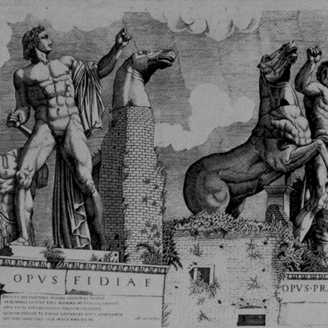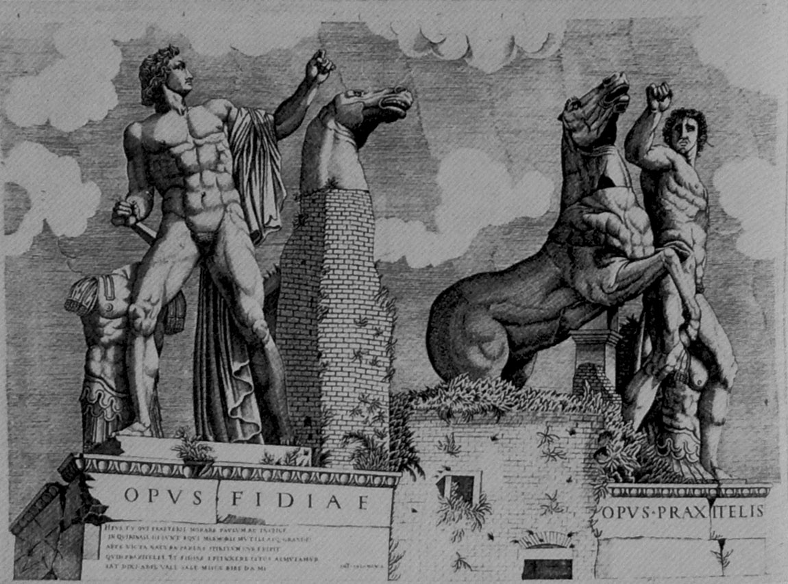 Άλλα σημαντικά αρχαία γλυπτά ορατά στη Ρώμη ήταν οι γνωστοί Διόσκουροι, έργα της εποχής των Σεβήρων, δύο μαρμάρινα συντάγματα ιπποδαμαστών, που παρίσταναν άνδρες γυμνούς σε διασκελισμό να κρατούν από τα χαλινάρια δύο άλογα που είχαν σηκωθεί στα πίσω τους πόδια. Είχαν στηθεί στην περιοχή των Θερμών του Κωνσταντίνου, στον Κυρινάλιο λόφο, που πήρε από αυτούς το όνομα Montecavallo ("λόφος των αλόγων") και αναφέρονται ήδη στα μέσα του 12ου αιώνα στα Mirabilia Urbis Romae ("αξιοθαύμαστα της πόλης Ρώμης"). Επιγραφές στο βάθρο τους από τις αρχές του 16ου αιώνα τα αποδίδουν στον Φειδία και στον Πραξιτέλη («Opus Phidiae», «Opus Praxitelis»· εικ. 346), με αποτέλεσμα να δημιουργηθεί η εντύπωση ότι οι μεγαλύτεροι γλύπτες της Αρχαιότητας ανταγωνίζονται εδώ σε έναν ιδεατό αγώνα για τα πρωτεία της τέχνης τους. Η τέχνη της Αρχαιότητας, ωστόσο, στον Μεσαίωνα φαίνεται ότι δεν ενδιέφερε ούτε απασχολούσε τους καλλιτέχνες της εποχής.