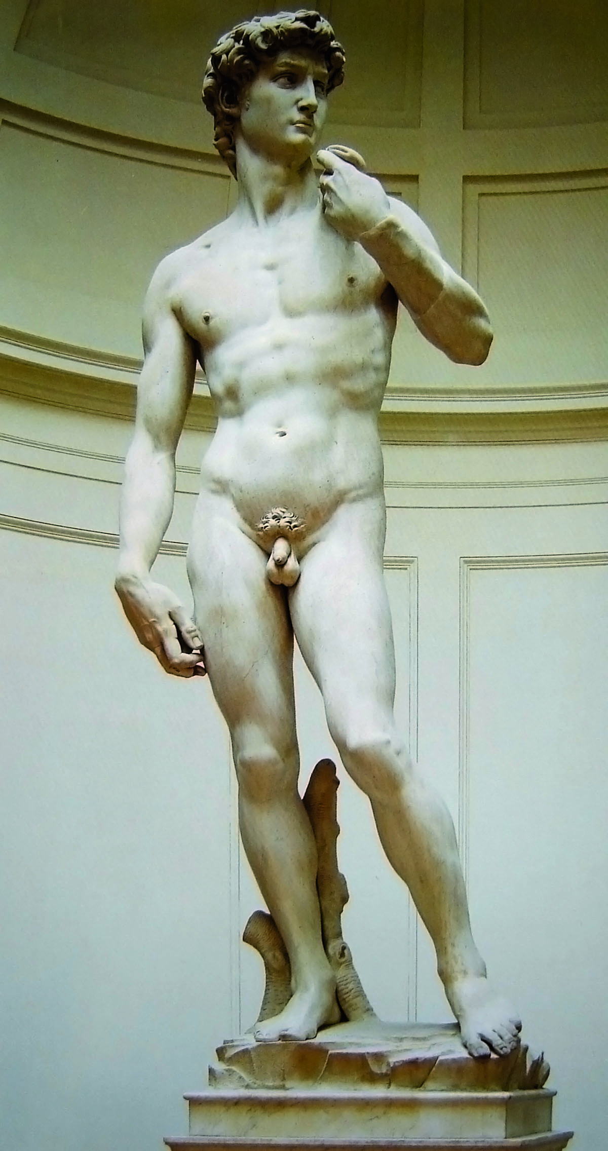 Το 1503 ανατέθηκαν στον Λεονάρντο η Μάχη του Anghiari και στον Μιχαήλ Άγγελο (1475-1564) η Μάχη της Cascina, δύο τεράστιες τοιχογραφίες που θα διακοσμούσαν την αίθουσα του Μεγάλου Συμβουλίου στο Palazzo della Signoria στη Φλωρεντία. Αν και τα ζωγραφικά αυτά έργα δεν ολοκληρώθηκαν ποτέ, στα προπαρασκευαστικά σχέδια και των δύο καλλιτεχνών παρατηρούνται ποικίλες επιρροές από ανάγλυφα ρωμαϊκών σαρκοφάγων. Για τον Μιχαήλ Άγγελο, τον πιο γνωστό και αντιπροσωπευτικό καλλιτέχνη της κλασικής Αναγέννησης, είχε προηγηθεί το ημιτελές του νεανικό ανάγλυφο, η Κενταυρομαχία, σήμερα στο Museo di Casa Buonarroti στη Φλωρεντία. Πρόκειται για μια πολύπλοκη μελέτη γυμνών σωμάτων, που συγκρούονται λυσσαλέα σε μια ξεχωριστή σύνθεση, ένα έργο που τοποθετήθηκε ανάμεσα σε σημαντικά αρχαία στον κήπο του Λορέντσο του Μεγαλοπρεπή των Μεδίκων στη Φλωρεντία. Περίπου 10 χρόνια αργότερα, το 1504, στήθηκε στην Piazza della Signoria ο περίφημος Δαβίδ του (εικ. 371), ένα γυμνό υπερφυσικού μεγέθους, μια προσωπική, αλλά και κλασικίζουσα απάντηση στον Δαβίδ του Ντονατέλο (εικ. 352). Ελάχιστα είναι τα σχέδια ή οι σπουδές του Μιχαήλ Αγγέλου που αντιγράφουν πιστά αρχαία έργα. Θεωρούν ότι είχε δει τον λεγόμενο Θησέα του Παρθενώνα σε σχέδιο του Κυριακού από την Ανκόνα και τον χρησιμοποίησε ως πρότυπο για τον Αδάμ στην περίφημη σύνθεσή του στην Καπέλα Σιστίνα (Capella Sixtina) στη Ρώμη. Ο Μιχαήλ Άγγελος είπε για τον εαυτό του ότι χρωστάει τα πάντα στην Αρχαιότητα. Τα κλασικά αγάλματα στο Belvedere του Βατικανού, καθώς και άλλα έργα της αρχαίας πλαστικής, προσφέρουν στον Μιχαήλ Άγγελο λύσεις και ιδέες που συνεχώς διασκευάζει και προσαρμόζει στις δικές του σταθερές. Ο Λαοκόων διακρίνεται πίσω από τον Απόστολο Ματθαίο (Φλωρεντία, Accademia) και πίσω από τους δυο Σκλάβους (Λούβρο), ενώ η μελέτη και επίδραση από τον κορμό Belvedere εμφανίζεται σε μορφές Σκλάβων στην οροφή της Καπέλα Σιστίνα, καθώς και στους περίφημους non finito (ημιτελείς) μαρμάρινους Σκλάβους Boboli (Φλωρεντία, Accademia· εικ. 372).