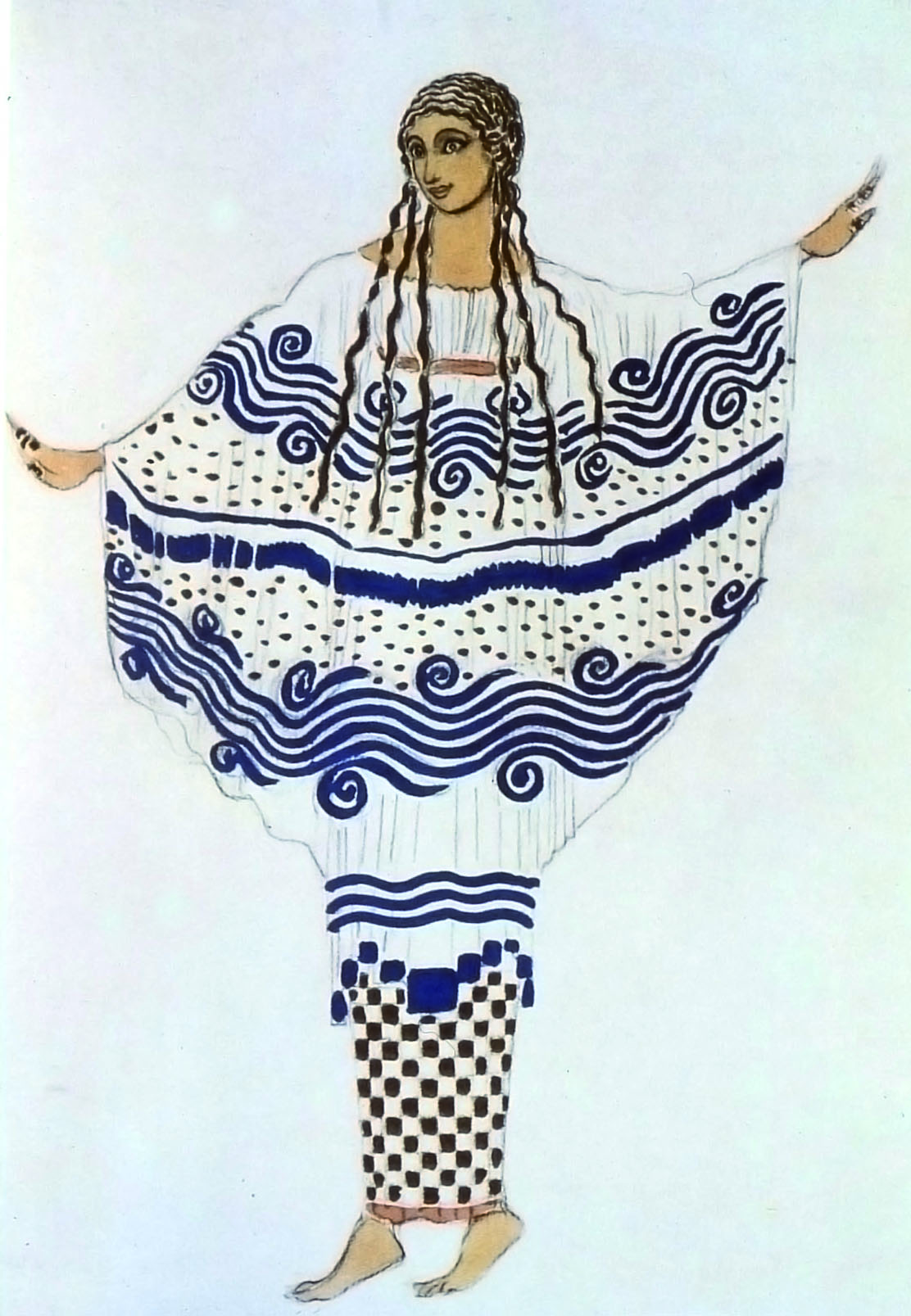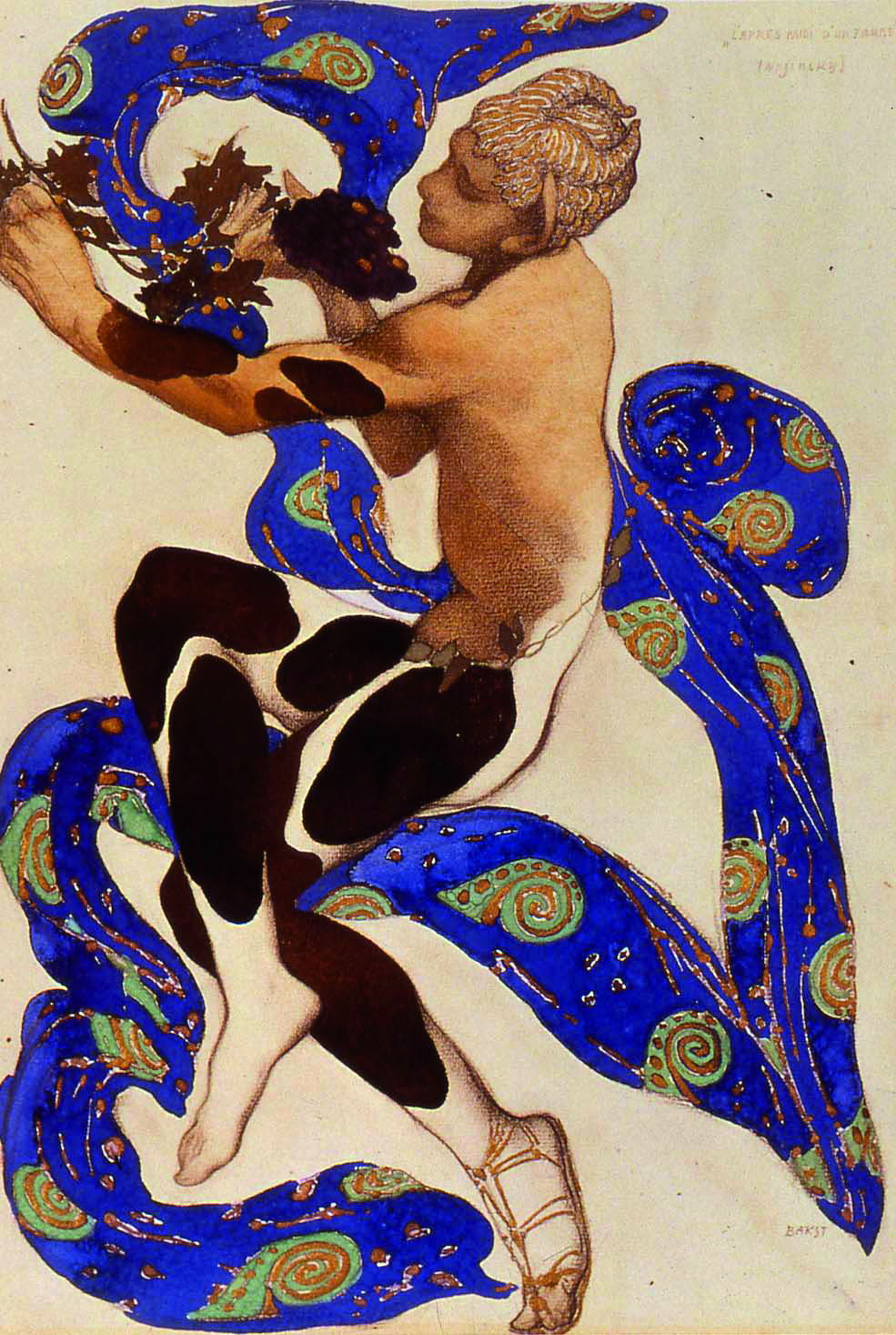 Από το νέο στιλ και τον γαλλικό συμβολισμό επηρεάζονται στα τέλη του 19ου και στις αρχές του 20ού αιώνα πολλοί δημιουργοί των Ρωσικών Μπαλέτων, ιδιαίτερα όταν βρίσκονται στο Παρίσι από το 1909 και εξής. Ένας σημαντικός τους εκπρόσωπος είναι ο Λεόν Μπακστ (1866-1924), ζωγράφος, σκηνογράφος και ενδυματολόγος, με κλασική παιδεία, προικισμένος με πλούσια φαντασία και ευρηματικότητα. Ο Μπακστ λάτρευε την ελληνική Αρχαιότητα και την Ανατολή, περιοχές που αντιμετώπισε σκηνογραφικά συχνά στην καριέρα του. Το 1905 ταξίδεψε στην Ελλάδα, στην Αθήνα και στα ελληνικά νησιά. Οι εντυπώσεις του από το ταξίδι είχαν σημασία για την επιτυχία των μπαλέτων του Ντιάγκιλεφ στο Παρίσι, καθώς τις αξιοποίησε πολύ δημιουργικά στα περίφημα κοστούμια του για τα μπαλέτα με ελληνικά θέματα (Ιππόλυτος, Οιδίπους, Κλεοπάτρα, Νάρκισσος, Ελένη της Σπάρτης κ.ά.) Στο Απόγευμα ενός φαύνου (1912) ο Μπακστ χρησιμοποιεί αρχαϊκά μοτίβα από αττικά αγγεία και έργα της πλαστικής, μετατρέποντάς τα σε ευφάνταστες πολύχρωμες δημιουργίες του νέου στιλ (εικ. 462 και εικ. 463). Στο μπαλέτο αυτό η χορογραφία του Νιζίνσκι είναι επίσης εμπνευσμένη από αρχαία αγγεία, με αποτέλεσμα να μετατρέπει τη σκηνή σε μια κινούμενη αρχαϊκή ζωφόρο, ενώ η μουσική του Ντεμπυσί επιχειρεί να αποδώσει την αρχαϊκότητα του θέματος. Αντίστοιχα, στο μπαλέτο Δάφνις και Χλόη, που ανεβάστηκε επίσης από τα Ρωσικά Μπαλέτα στο Παρίσι το 1912 με μουσική του Μορίς Ραβέλ και με θαυμάσια αρχαιοπρεπή κοστούμια του Μπακστ, η Αρχαιότητα ως σημείο αναφοράς αντιμετωπίζεται με μια δυναμική ελευθερία και έμπνευση.
