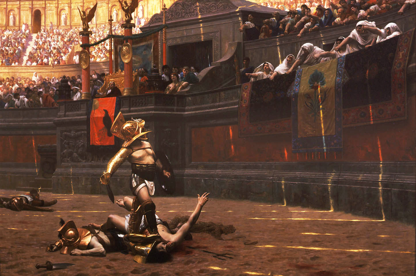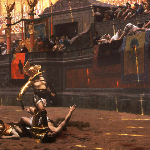 • Ο Ζαν Λεόν Ζερόμ ζωγράφισε αυτόν τον πίνακα γύρω στα 1859. Ο αντίχειρας πολλώ θεατών είναι γυρισμένος προς τα κάτω — κακά μαντάτα για τον νικημένο μονομάχο.